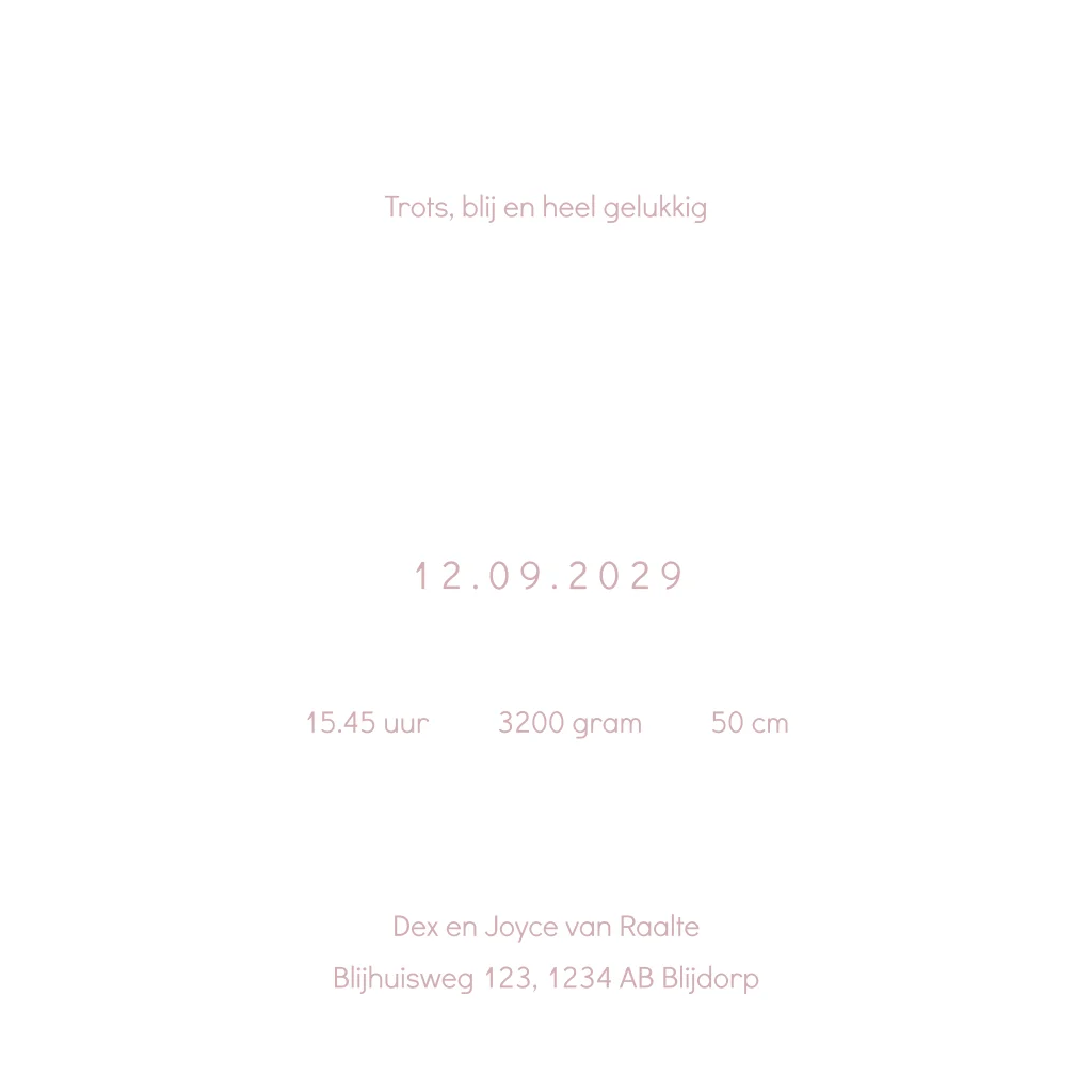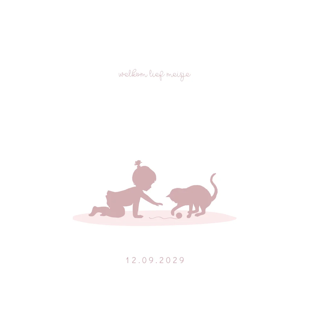 Op dit geboortekaartje voor een meisje zie je een silhouetje van een klein meisje, spelend met een kat. De kaart is overwegend wit, de silhouetten hebben een mooie oudroze kleur. De gouden foliedruk maakt dit geboortekaartje Alyke helemaal af. Pas dit geboortekaartje geheel naar eigen wens aan in de ontwerpmodule. Hulp nodig? Wij helpen je graag om het perfecte geboortekaartje voor je meisje te maken! Ook mogelijk met andere gezinssamenstelling.