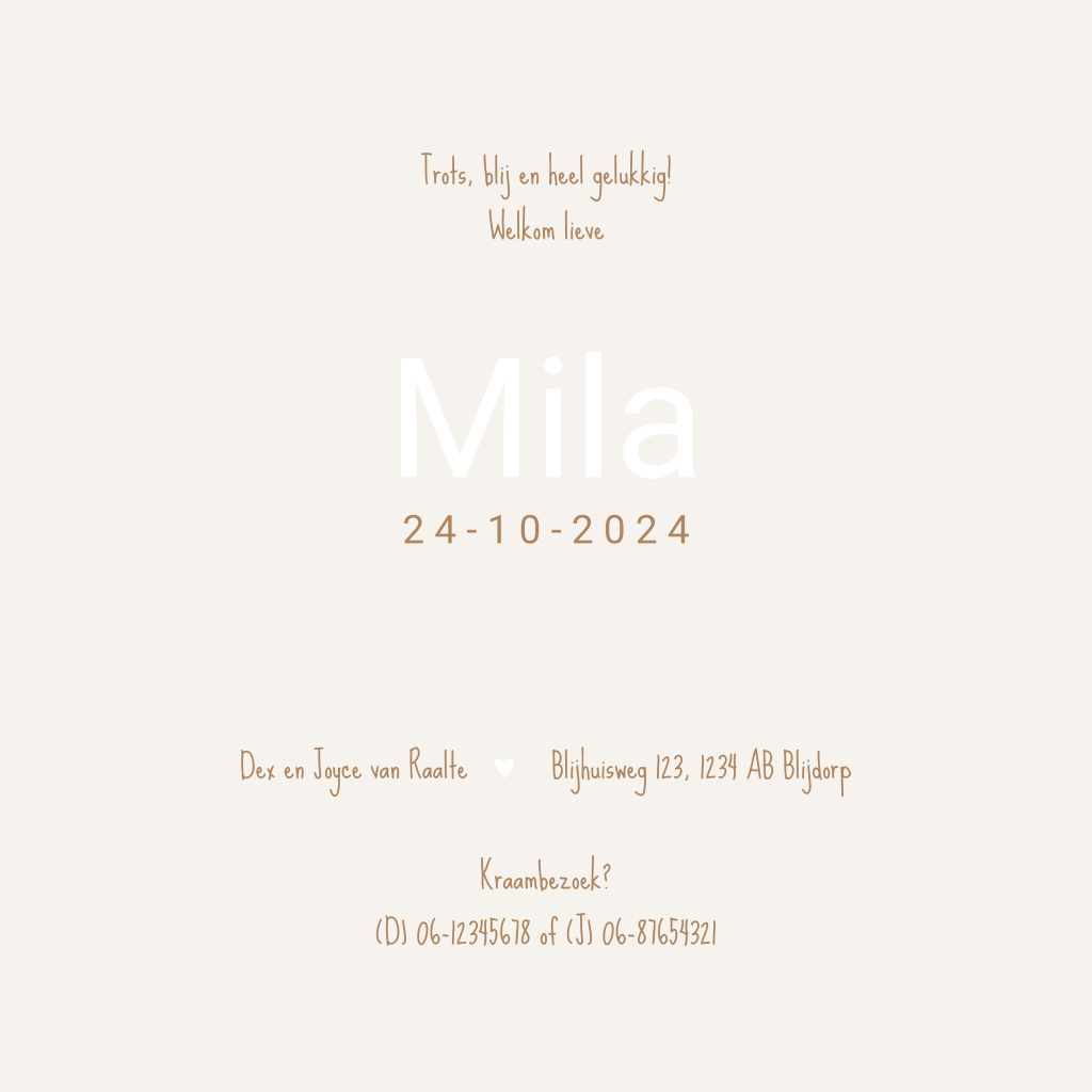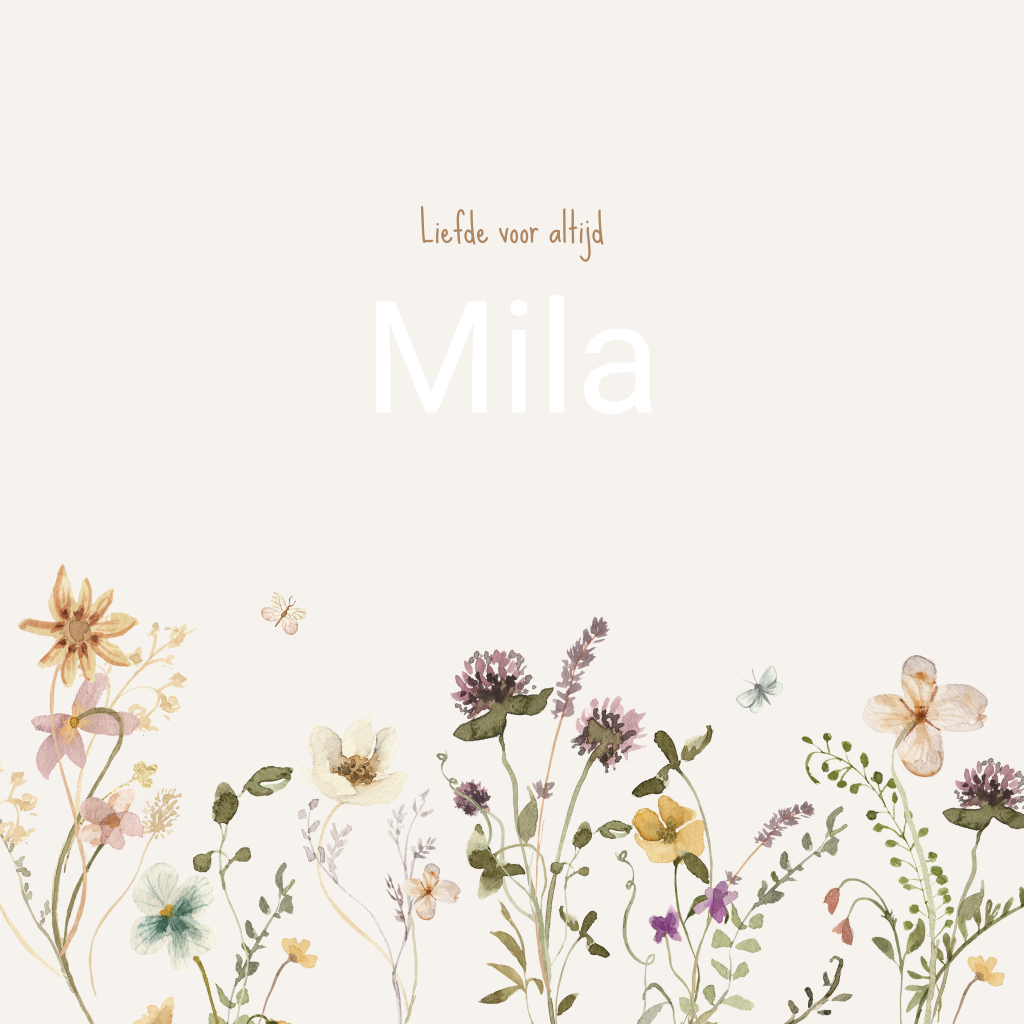 Luxe geboortekaartje met prachtige aquarel veldbloemen en vlindertjes. De babynaam en een aantal elementen op de voor-, binnen- en achterzijde worden gedrukt in écht goudfolie. De folie heeft een mooie glans en geeft de kaart een exclusieve uitstraling. De teksten en lettertypes van dit lieve romantische kaartje Mila zijn aan te passen in de editor. De kleur van de folie kun je wijzigen naar goudfolie, koperfolie, zilverfolie of zwartfolie.