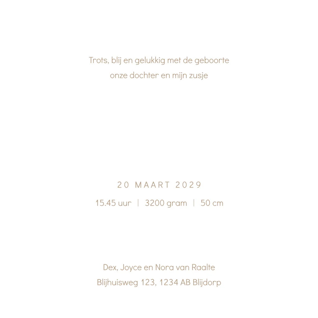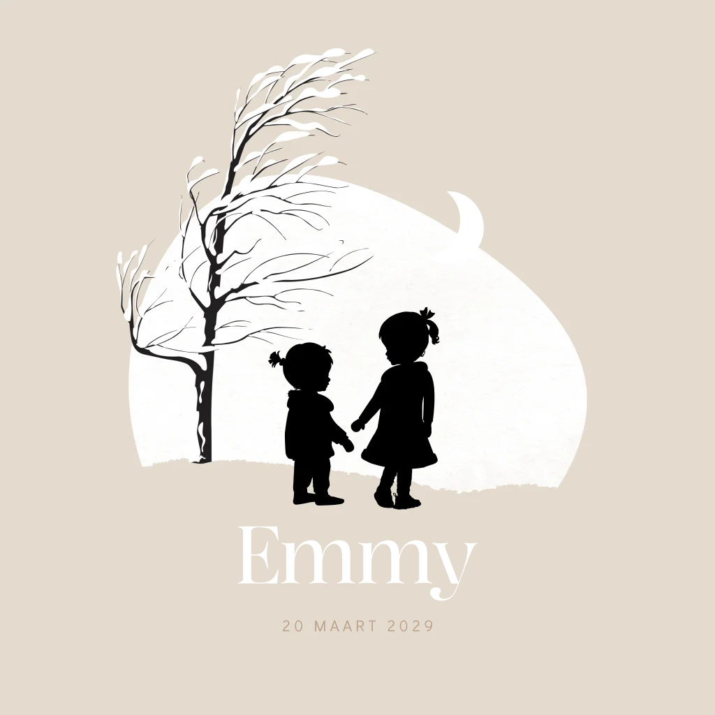 Stijlvol silhouet geboortekaartje met een winter thema. Dit winter geboortekaartje Emmy is geschikt voor een tweede kindje, een zusje. Je ziet een silhouetje van een grote zus met haar kleine zusje. Op de achtergrond een boom in de wind bedekt met sneeuw met op de achtergrond een maan in goudfolie. Het geboortekaartje heeft een beige achtergrond en het tafereeltje vindt plaats voor een wit organisch kiezelvormig vlak. De goudfolie geeft een luxe uitstraling aan dit overwegend rustige geboortekaartje.