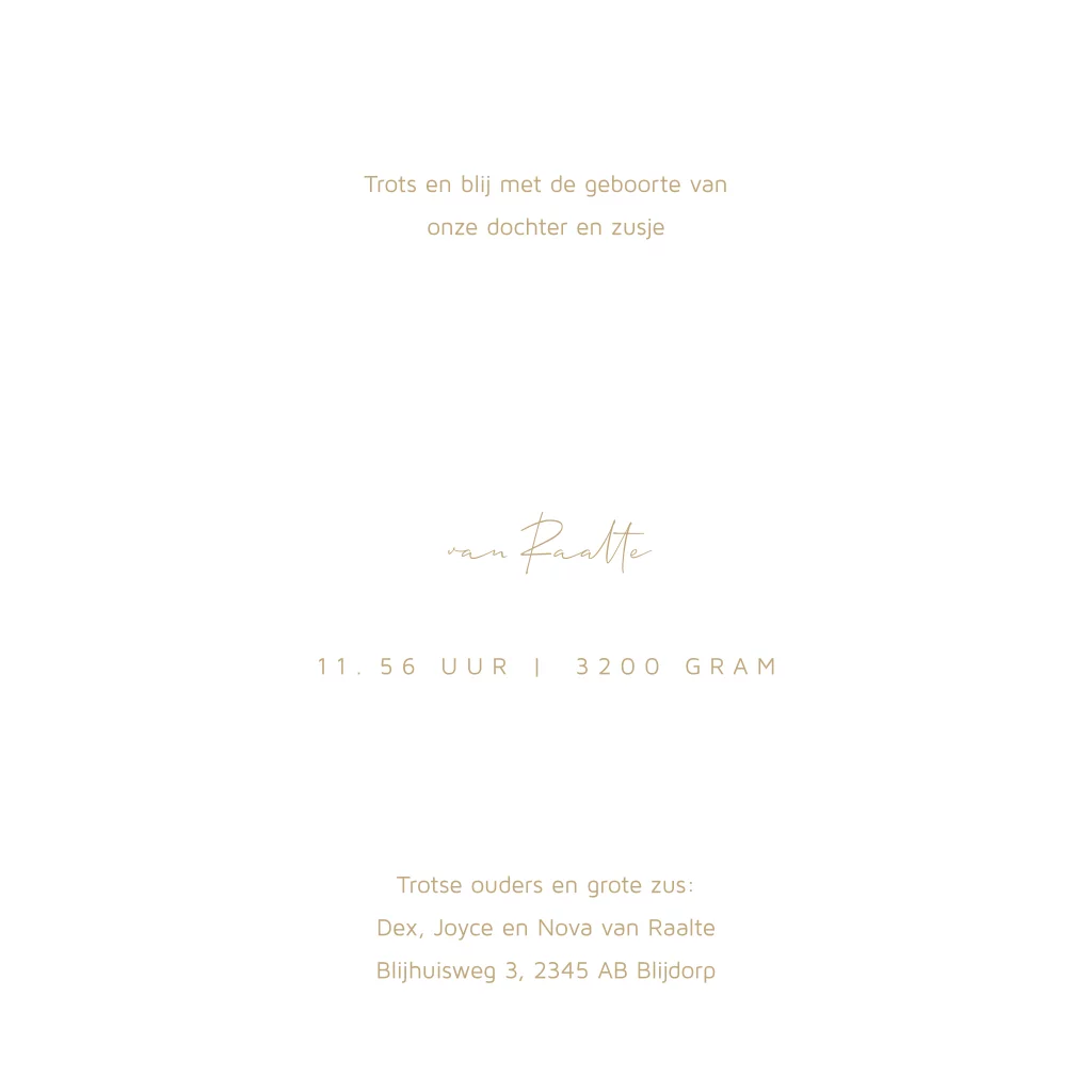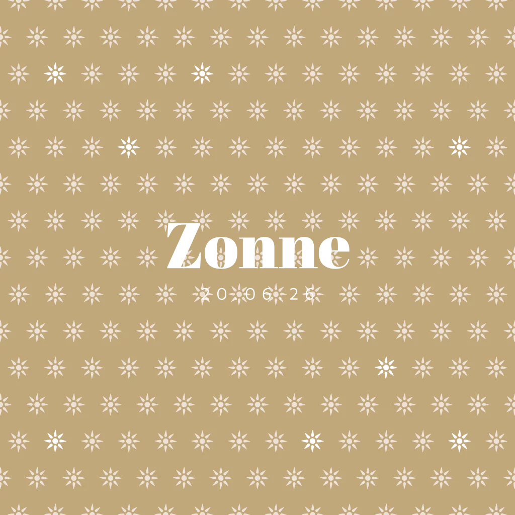 Exclusief geboortekaartje voor een meisje. Dit mooie geboortekaartje Zonne heeft op de beige achtergrond een patroon van witte zonnetjes, afgewisseld met enkele zonnetjes in echt gouden foliedruk. Ook de naam en de geboortedatum wordt gedrukt in echt goudfolie. Teksten en kleuren zijn aan te passen in onze editor. Ook de kleur van de folie kun je makkelijk wijzigen naar roséfolie, zilverfolie of koperfolie.