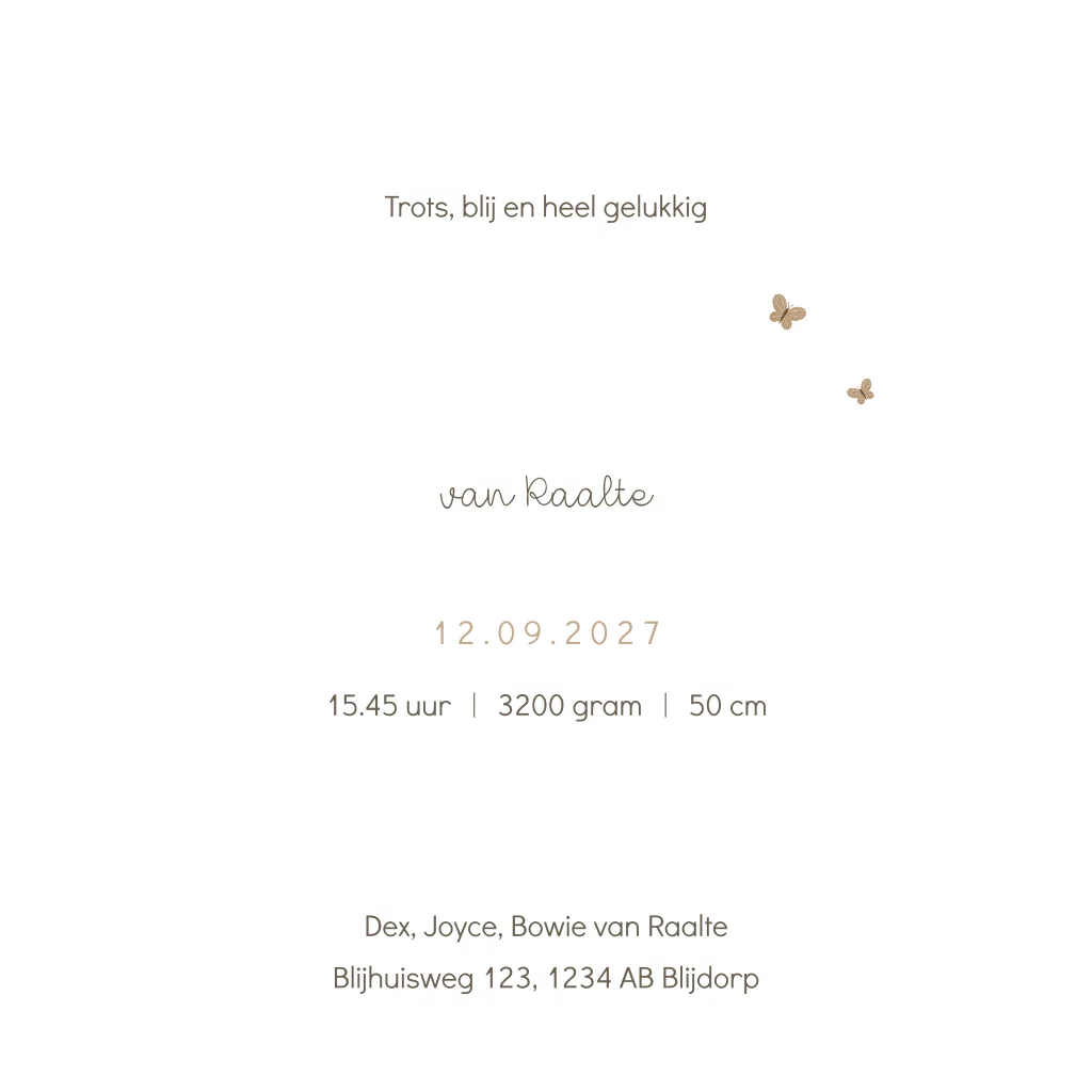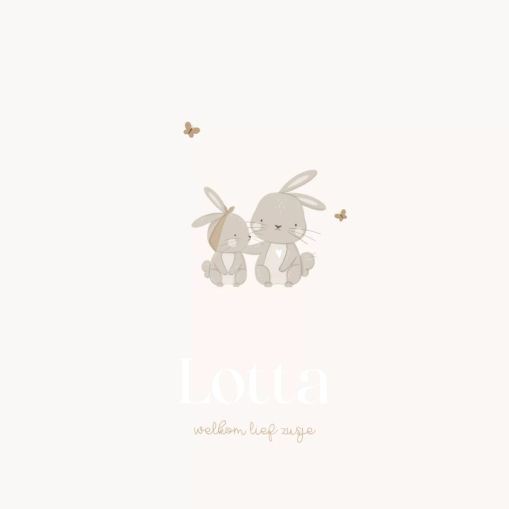 Wanneer je kleinste spruit geboren wordt, is het tijd voor een leuk geboortekaartje. Dit geboortekaartje Lotta is lief en rustig tegelijk. Op dit beige kaartje zie je twee lieve konijntjes met vlindertjes. Perfect voor de geboorte van een tweede kindje, een zusje. Het kaartje is bedrukt op kwalitatief hoogwaardig papier en is afgewerkt met goudfolie, waardoor het kaartje er extra luxe uit ziet. Dit geboortekaartje voor een meisje heeft mooie rustige tinten en kun je in de editor aanpassen naar je eigen smaak.