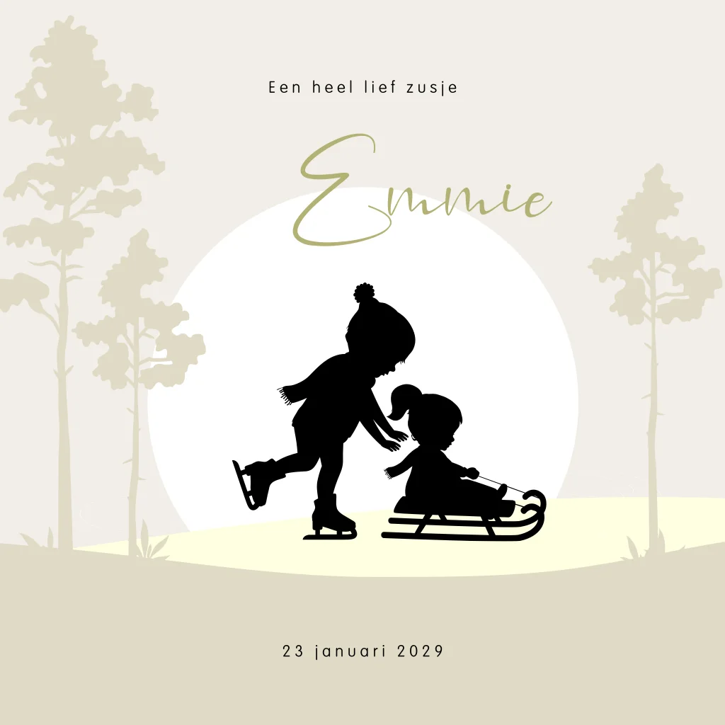 Prachtig winters geboortekaartje voor tweede kindje, een meisje. Op dit geboortekaartje Emmie zie je een grote zus schaatsen op het ijs met haar kleine zusje die op een slee zit. De kaart heeft zachte natuurlijke tinten. Dit geboortekaartje is perfect voor een baby die geboren wordt in de winter.