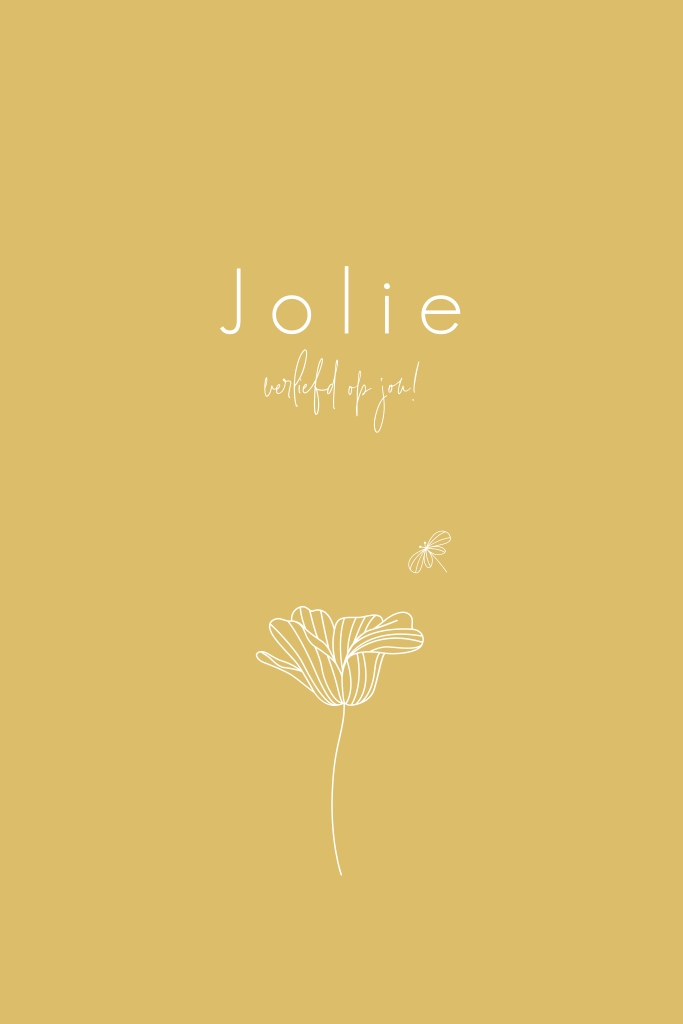 Geboortekaartje voor een dochter met een lijntekening van een stijlvolle bloem. De babynaam wordt gedrukt in echt goudfolie. Een mooie combinatie met de trendy gele achtergrond. Dit kaartje Jolie heeft een basic design, maar krijgt door de foliedruk een luxe uitstraling. Extra speciaal aan dit kaartje zijn de ronde hoeken.