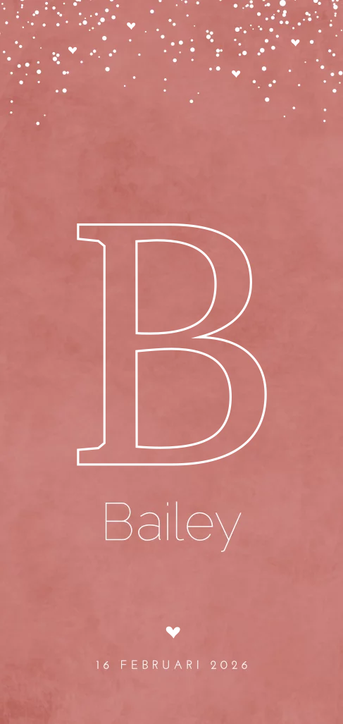 Rondhoek meisjes geboortekaartje met de eerste letter van de babynaam in outline. Extra speciaal aan dit kaartje Bailey, is dat de voorletter en de kleine hartjes, worden gedrukt in écht goudfolie. De folie heeft een mooie glans en geeft de kaart een exclusieve uitstraling. Verder op dit kaartje een stipjes patroon en enkele hartjes. De rode velvet / velours achtergrond heeft een warme uitstraling. De teksten en kleuren kun je aanpassen in de editor. De kleur van de folie kun je wijzigen naar koperfolie, zilverfolie zwartfolie, of roséfolie.