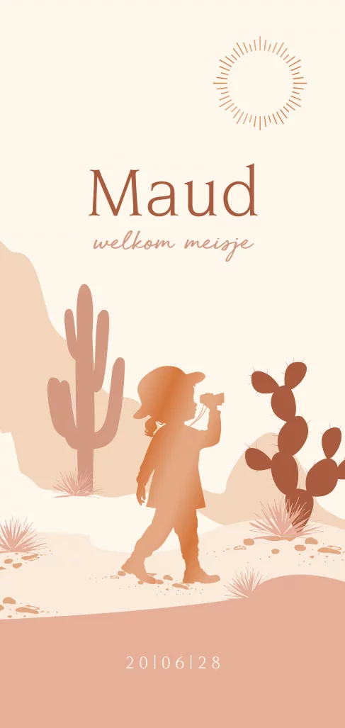 Avontuurlijk silhouet geboortekaartje voor een dochter! Op dit babykaartje Maud een meisje met safarihoed en verrekijker in de uitgestrekte woestijn met rotsen en cactussen. Wat dit kaartje extra speciaal maakt, is dat het silhouetje van het meisje en het stralende zonnetje worden gedrukt in hoogglans. De hoogglans bedrukking heeft een mooie glans en geeft het kaartje een extra luxe uitstraling. Pas dit kaartje met ronde hoeken naar je eigen smaak aan in de editor.