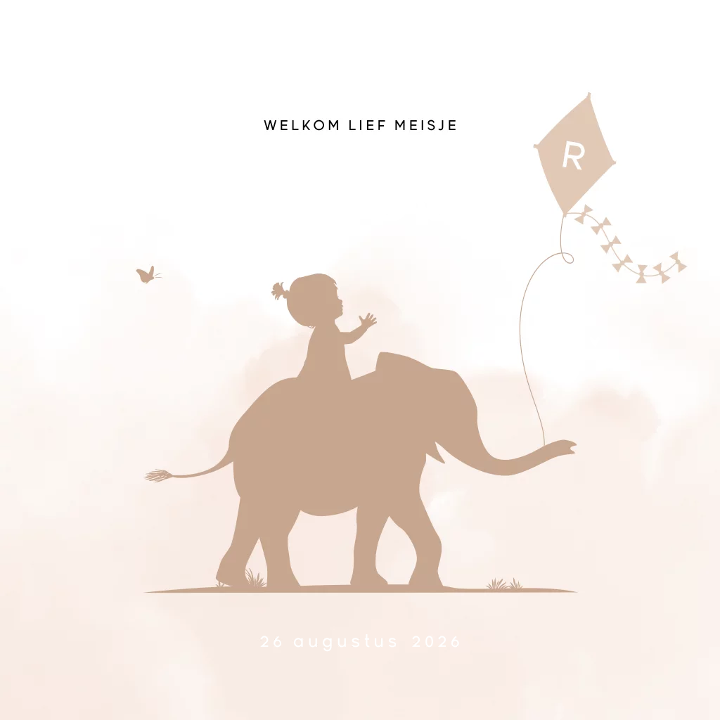 Lief geboortekaartje voor een eerste kindje, een dochter! Op dit silhouet kaartje Rosa een meisje op de rug van een olifant die een vlieger vast heeft. Het leuke van de vlieger is dat de beginletter van de babynaam hierin gezet kan worden. Verder enkele hartjes en een vlindertje met een roze watercolor aquarel achtergrond. De gouden elementen op deze kaart worden gedrukt in echt goudfolie. Dit geeft het babykaartje een luxe uitstraling. Pas het kaartje naar je eigen smaak aan in de editor. Ook mogelijk voor een andere gezinssamenstelling of met andere foliedruk zoals koperfolie, roséfolie of zilverfolie.