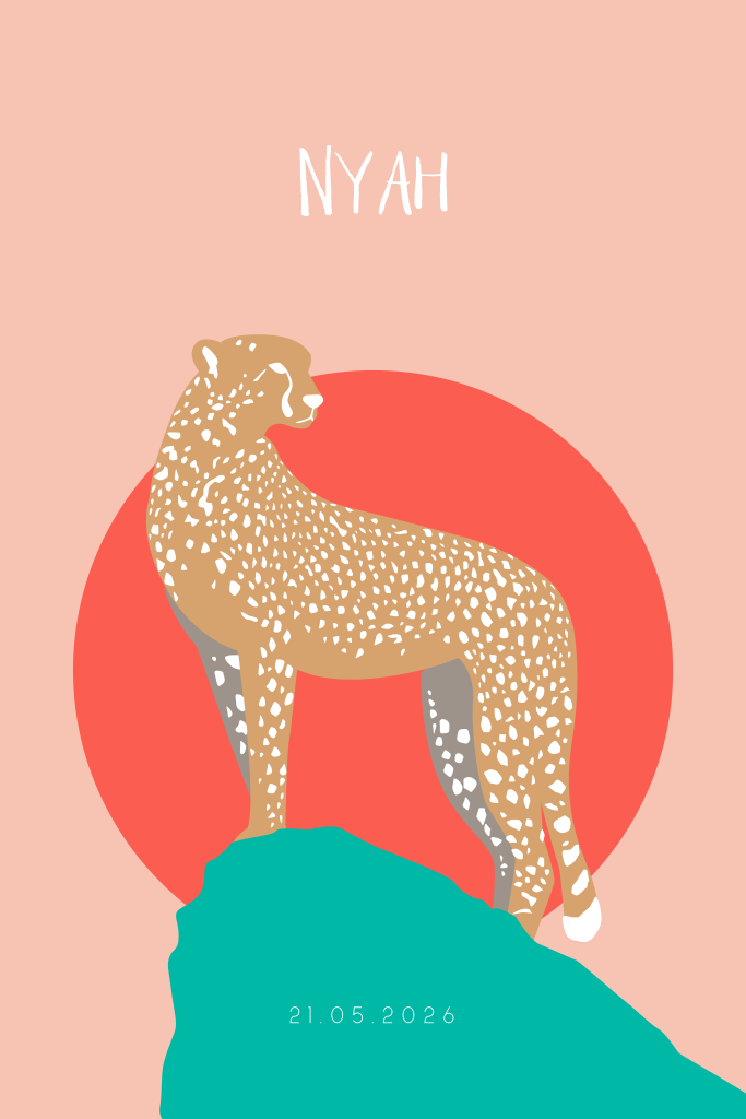 Hip en vrolijk geboortekaartje voor een jongen of meisje. Op dit kleurrijke geboortekaartje Nyah staat een cheetah op een rotsblok voor een ondergaande zon. De stippen van het jachtluipaard en de naam van je kindje worden gedrukt in echt zwartfolie. Foliedruk heeft een mooie glans wat deze kaart extra opvallend maakt. Teksten, kleuren en lettertypes kun je zelf aanpassen in de editor. Specifieke wensen of hulp nodig? Bel, mail of chat gerust, we helpen je graag!