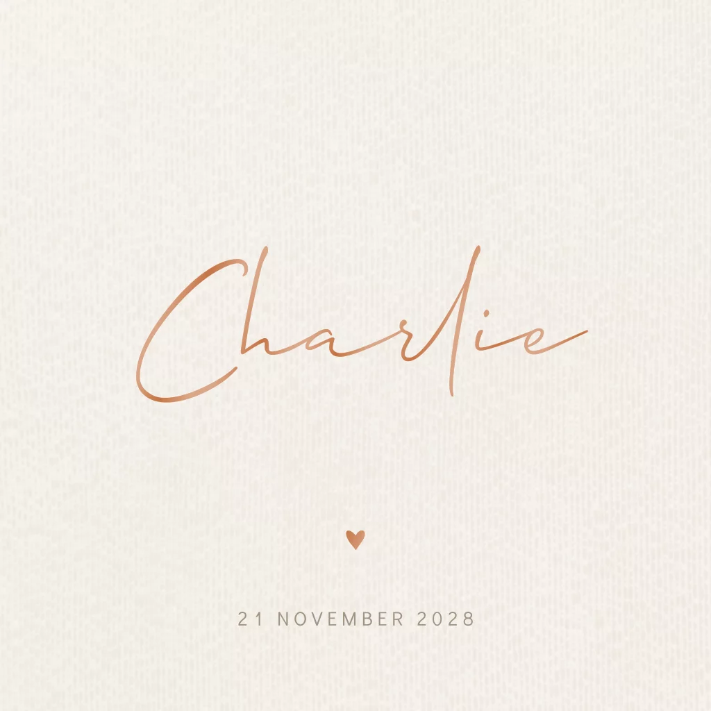 Rustig neutraal geboortekaartje voor zowel een jongen als een meisje met een beige achtergrond met subtiele lijntjes, en een klein hartje. De ronde hoeken en hoogglans bedrukking maken dit gender neutrale babykaartje Charlie extra speciaal. Pas de teksten, kleuren en lettertypes naar je eigen smaak aan in de editor. Ook kun je zelf bepalen of je ronde hoeken wilt en welke kleur hoogglans.