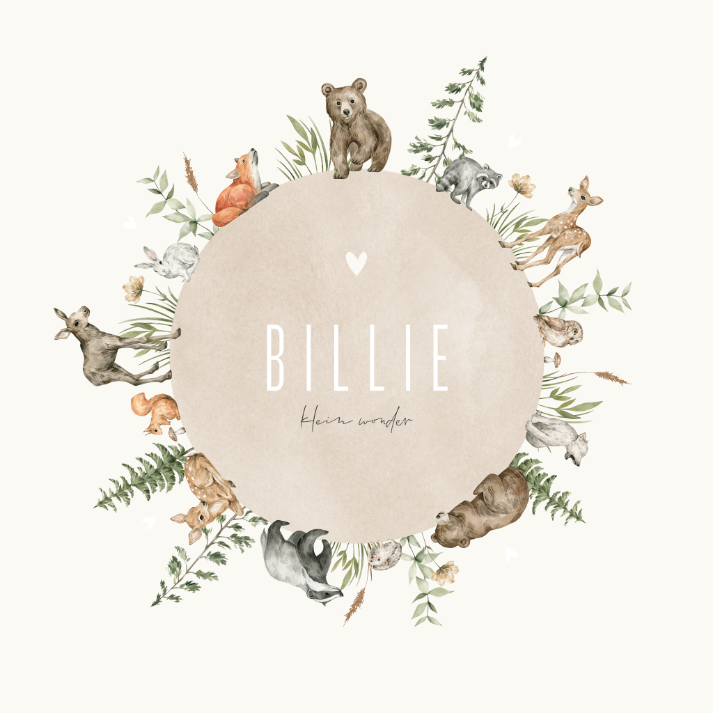 Lief geboortekaartje voor een dochter met verschillende vrolijke bosdieren rondom een cirkel of wereldbol, waaronder een beertje, hertje, vos en konijntje. Dit geboortekaartje Billie is genderneutraal en daarom ook geschikt voor een jongen. Door de gouden foliedruk heeft het kaartje een luxe uitstraling. De teksten en kleuren pas je gemakkelijk aan in de editor.