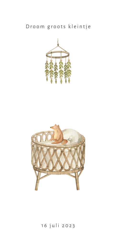 Lief unisex geboortekaartje met een rotan wieg met daarin een klein knuffeltje. Op dit kaartje Senna worden de babynaam en de kleine hartjes gedrukt in luxe goudfolie. Dit kaartje is zowel voor een meisje als voor een jongen te gebruiken en oogt rustig door de natuurlijke kleuren en materialen. Pas het kaartje naar je eigen wens aan in de editor. De kleur van de folie kun je wijzigen naar koperfolie, zilverfolie, zwartfolie of roséfolie.