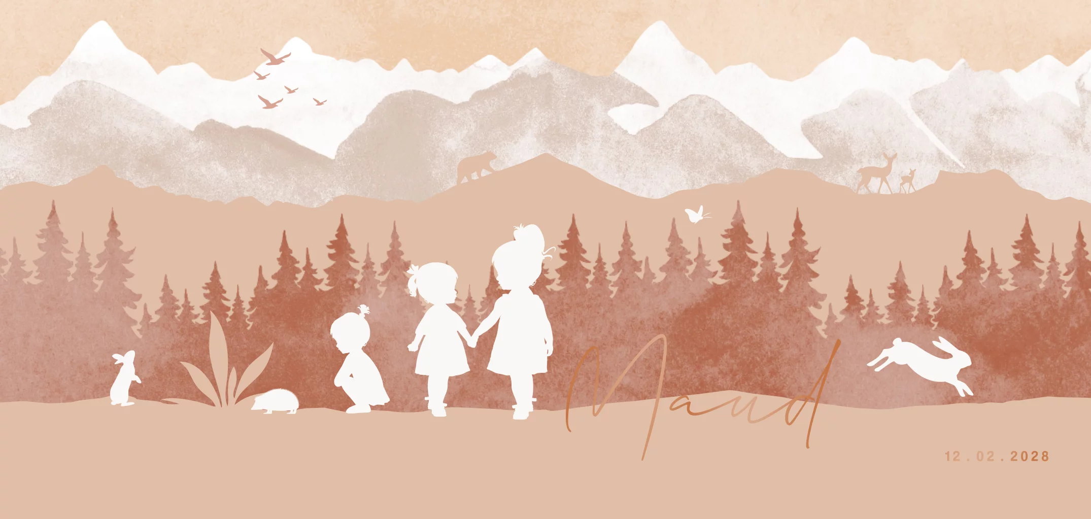 Wordt jullie dochter geboren in de herfst of winter? Kies dan voor dit prachtige panorama geboortekaartje voor een derde kindje, een zusje! Op dit hippe meisjeskaartje zie je drie zusjes wandelen in een roze ton sur ton berglandschap met verschillende bosdieren, waaronder een beer, hertje en konijn. Het gebruik van hoogglans geeft een luxe uitstraling aan dit babykaartje en past helemaal binnen het kleurenpalet.