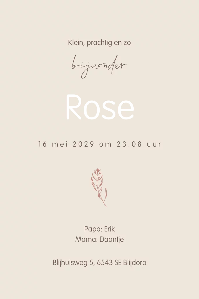 Dit geboortekaartje is een ontwerp van Jollein® uit de Meadow collectie en is speciaal in samenwerking met Jollein® ontworpen. Alle designelementen staan daarom vast waardoor het ontwerp zelf niet aanpasbaar is. Je kunt de teksten uiteraard wel gemakkelijk aanpassen in de editor.