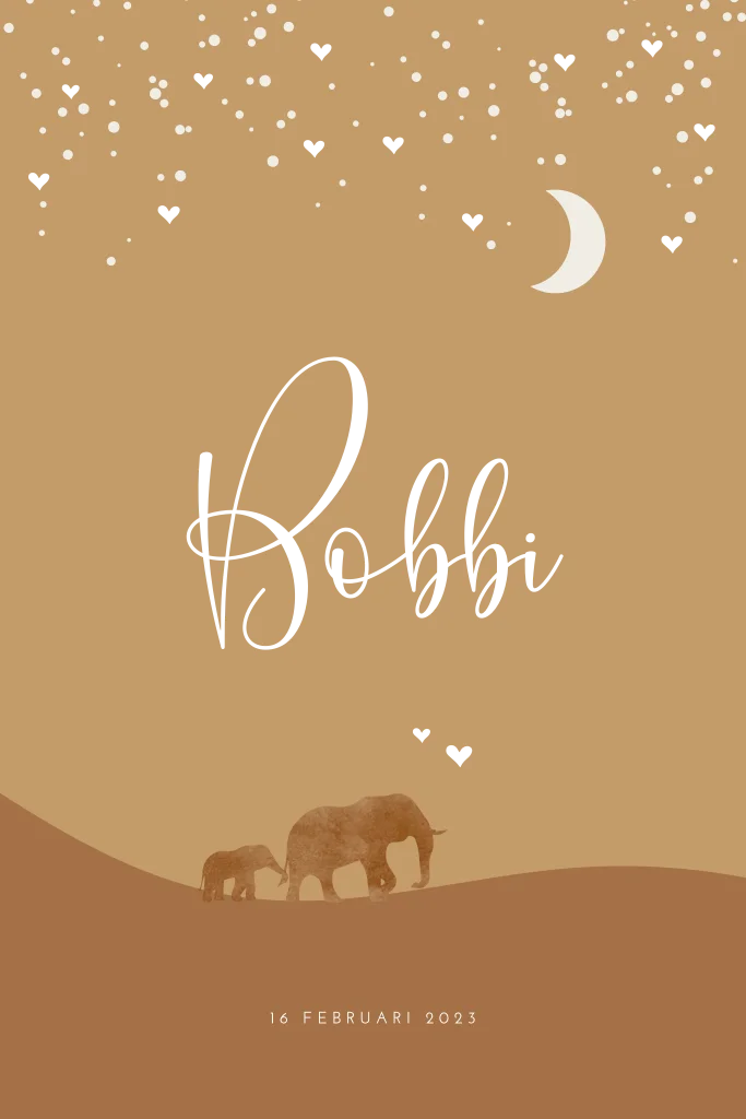 Geboortekaartje voor een meisje met lieve olifantjes op avontuurlijke safari. Wat dit kaartje Bobbi extra bijzonder maakt, is dat de babynaam en de kleine hartjes worden gedrukt in écht goudfolie. Door de glans van de folie krijgt de kaart een luxe uitstraling. Een mooie combinatie met de warme bruine kleuren.