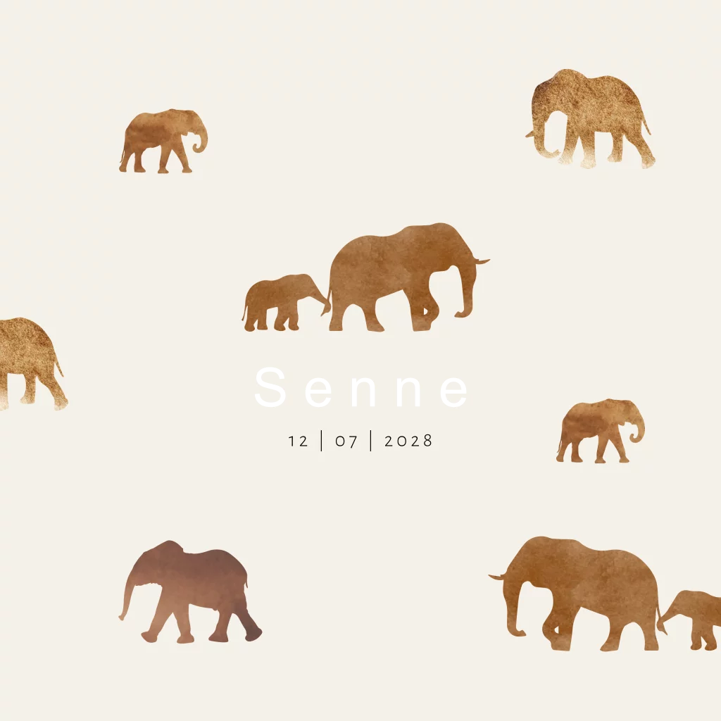 Geboortekaartje voor een jongen of meisje met een trendy olifantenprint. De naam van de baby wordt gedrukt in écht goudfolie, dit geeft het kaartje een extra luxe uitstraling. De lieve olifantjes hebben een warme caramel kleur. De ronde hoeken maken dit kaartje Selah helemaal af.