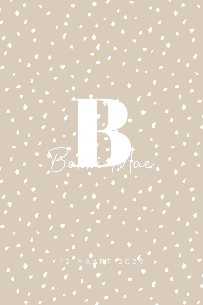 Spickle geboortekaartje voor een dochter met foliedruk. De initiaal en de volledige babynaam staan op de voorzijde van het kaartje. Op de achtergrond een wit stippenprintje op een zachte nougat kleur. De naam, geboortedatum en het kleine hartje worden gedrukt in écht goudfolie. De folie heeft een mooie glans en geeft een schitterende luxe uitstraling.