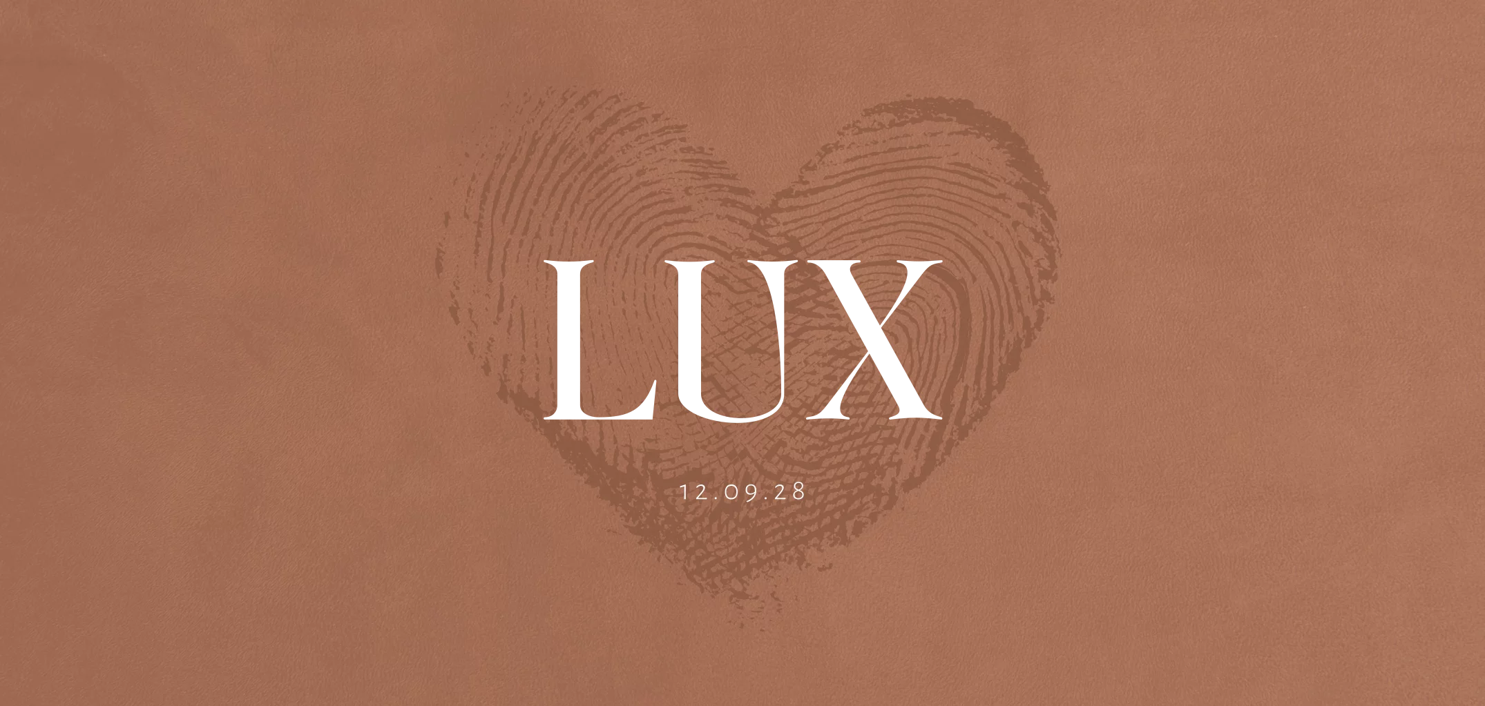 Unisex geboortekaartje voor een jongen of meisje met een basic design. Dit geboortekaartje Lux is geïnspireerd op het geboortekaartje van Anne Vedder. De achtergrond van het kaartje heeft een suède look in een bruine kleur. Je ziet twee grote vingerafdrukken in de vorm van een hartje met de babynaam Lux in goudfolie. Foliedruk geeft het geboortekaartje een extra luxe uitstraling en dit oogt heel stijlvol. Pas dit fingerprint geboortekaartje naar eigen wens voor jullie zoon of dochter aan in de online editor.