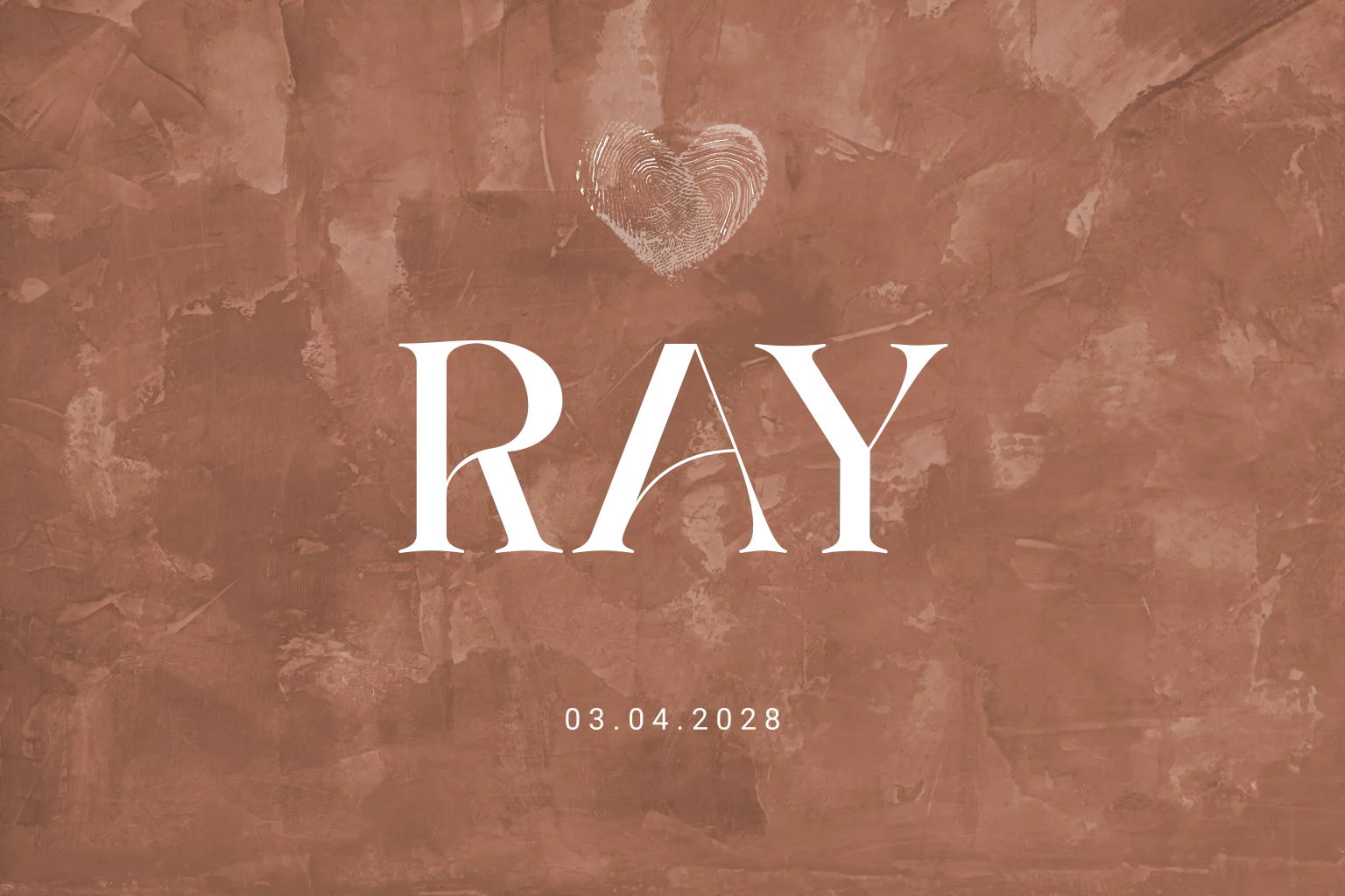 Geboortekaartje Ray voor een jongen of een meisje met een wat stoerder design. De babynaam en het kleine hartje worden gedrukt in goudfolie. Het goudfolie zorgt voor een extra luxe uitstraling op het geboortekaartje. Op de achtergrond zie je een betonlook structuur in een koper kleur. Boven de babynaam zie je twee vingerafdrukken in de vorm van een hartje. Dit geboortekaartje is geïnspireerd op het fingerprint geboortekaartje van Anne Vedder. Pas dit kaartje Ray naar eigen smaak aan in de editor.