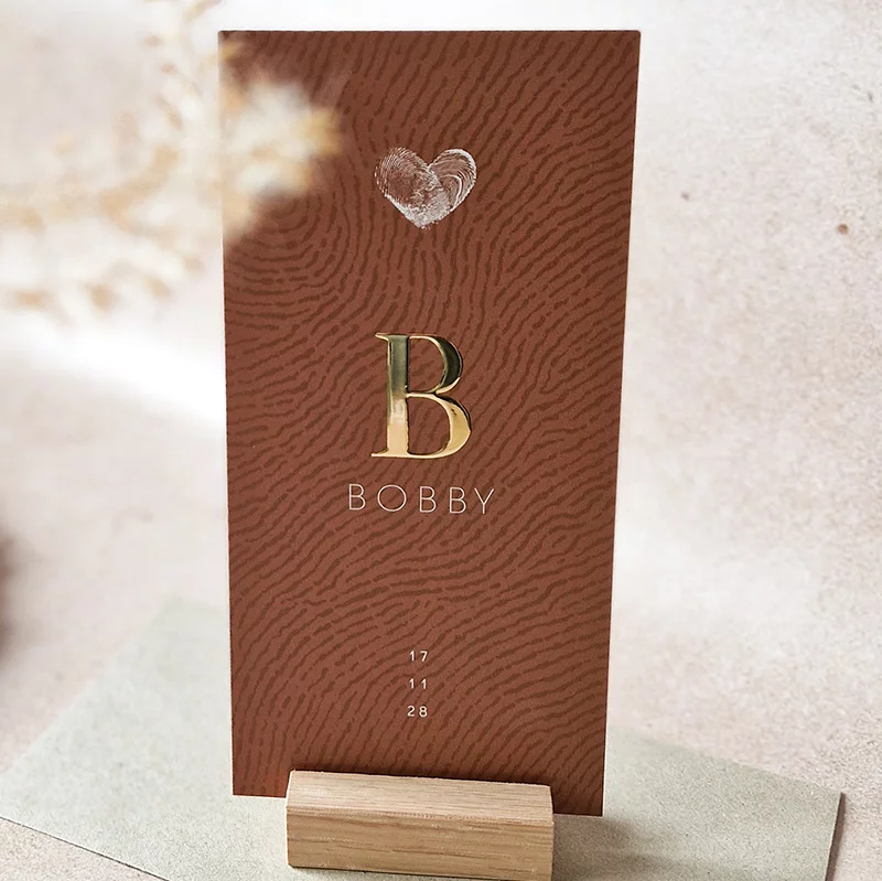 Unisex geboortekaartje Bobby voor een jongen of een meisje met initiaal, fingerprint en goudfolie. Dit langwerpige gender neutrale babykaartje heeft een vingerafdruk achtergrond met een hartje van twee vingerafdrukken en is geïnspireerd op het geboortekaartje van Anne Vedder. De foliedruk geeft een luxe uitstraling. Teksten en kleuren zijn makkelijk aan te passen in onze editor. Hulp nodig? We staan voor je klaar!
