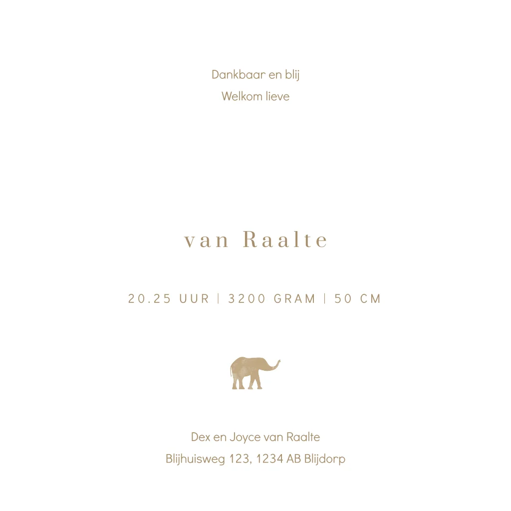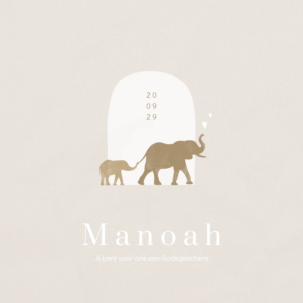 Op dit neutrale christelijke geboortekaartje Manoah vind je een schattig silhouet van twee olifanten, samen op pad. Een grote olifant met daarachter een klein olifantje die met zijn slurf de staart van de andere olifant vast heeft. De naam van jullie zoon of dochter wordt gedrukt in écht goudfolie, wat het kaartje extra bijzonder en luxe maakt. Dit kaartje is ook zeker geschikt voor een tweede kindje. Pas de teksten, kleuren en lettertypes naar je eigen smaak aan in de editor.