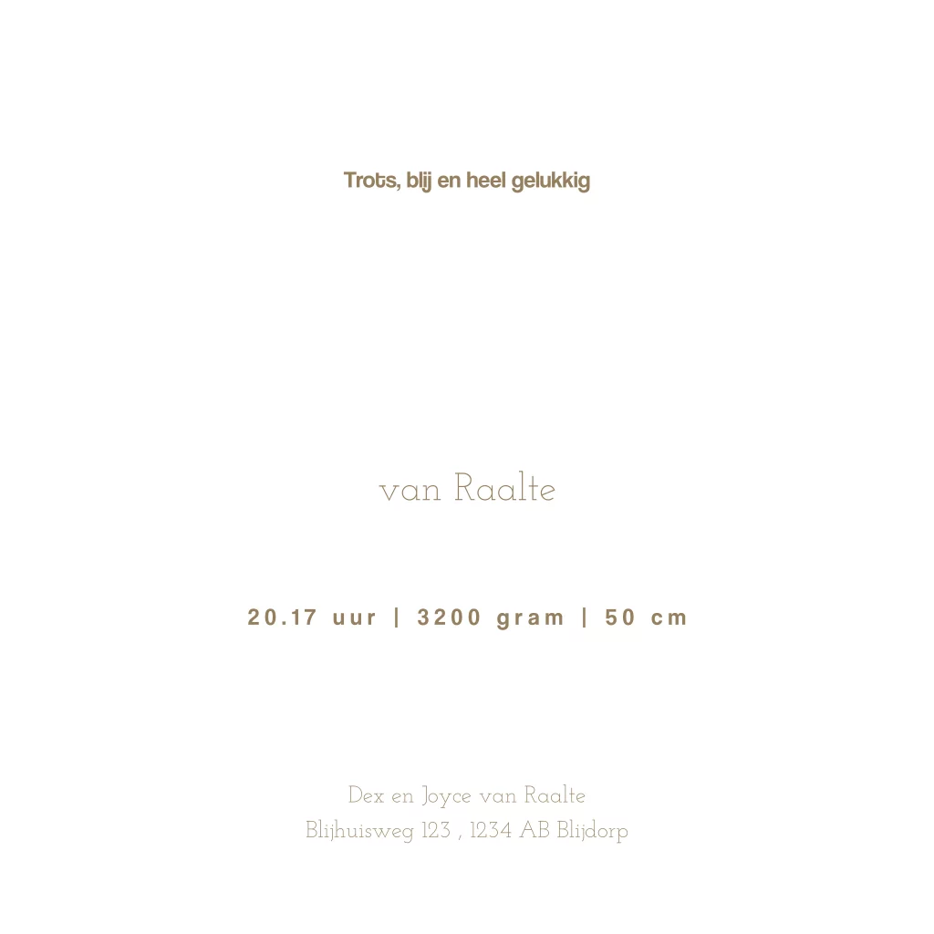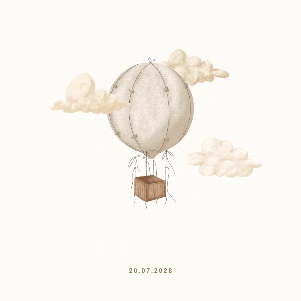 Op zoek naar een rustig geboortekaartje? Dan is dit gender neutrale geboortekaartje voor zowel een jongen als meisje zeker geschikt. Dit babykaartje Lewis heeft een rustige uitstraling door het gebruik van nude kleuren. De luchtballon tussen de wolken met goudkleurige sterretjes komen daardoor goed tot zijn recht. Op dit unisex geboortekaartje is gebruik gemaakt van écht goudfolie. De glanzende folie geeft een luxe uitstraling aan dit neutrale kaartje. Pas de kleuren en teksten gemakkelijk aan in de editor. Hulp nodig? Wij helpen je graag.