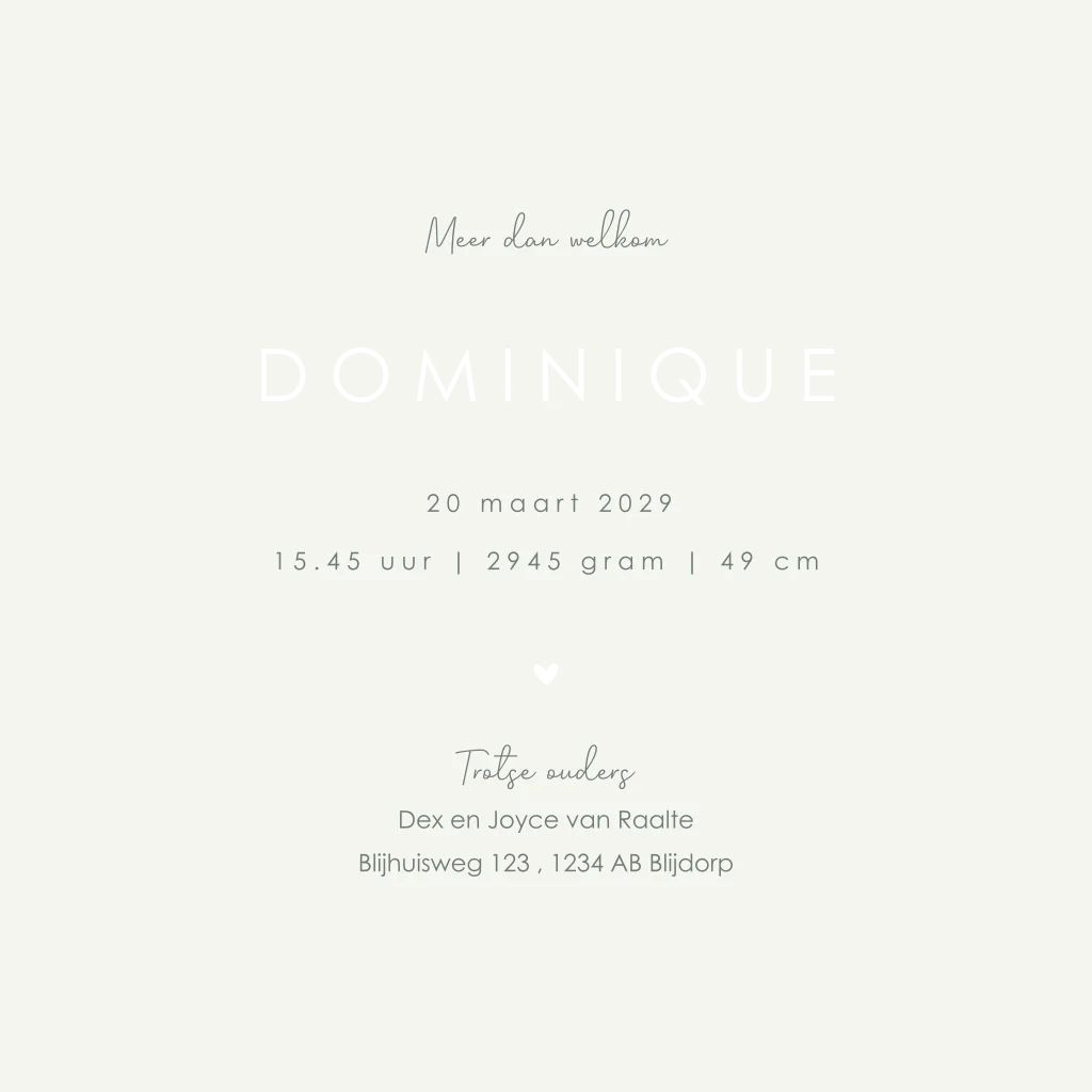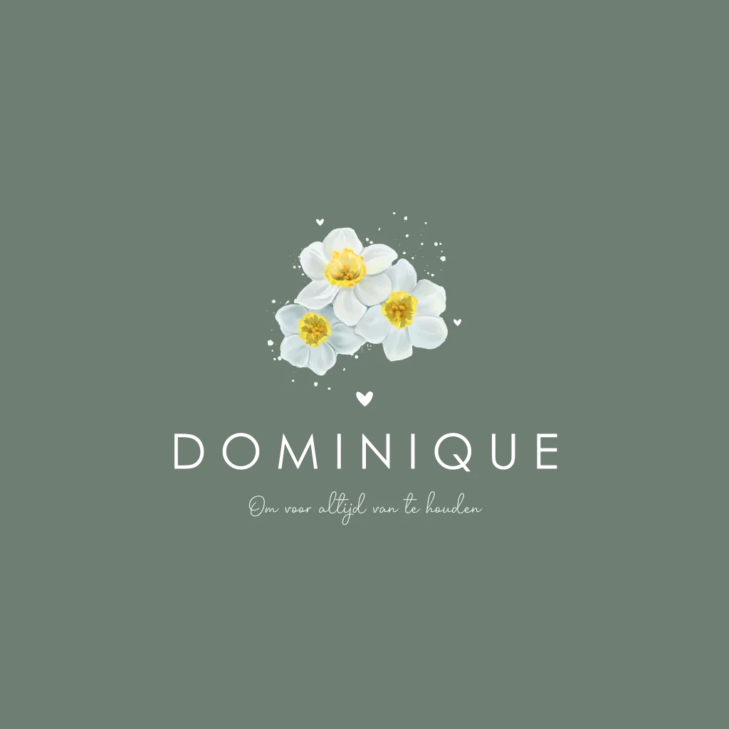 Dit unisex geboortekaartje Dominique is perfect voor een jongen of meisje. Op het kaartje staat een prachtige geboortebloem, passend bij de geboortemaand maart. De naam van jullie zoon of dochter en de hartjes rondom de narcissen worden gedrukt in écht goudfolie, wat het kaartje extra bijzonder en luxe maakt. Pas de teksten, kleuren of geboortebloem naar je eigen smaak aan in de editor.