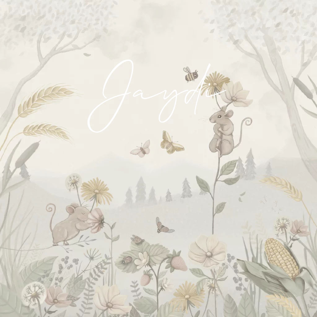 Unisex geboortekaartje voor een jongen of meisje met écht goudfolie. Dit gender neutrale geboortekaartje Jaydi is overwegend rustig door de zachte kleuren. Op dit babykaartje zie je schattige muisjes, uit de Dreamy Mouse collectie, in het bos tussen de bomen en bloemen. Tussen de muisjes en bloemetjes door vliegen ook bijen, vlinders en een lieveheersbeestje. De dubbelzijdige goudfolie geeft een luxe touch aan dit zachte geboortekaartje.