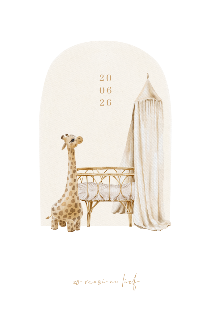 Rondhoek geboortekaartje voor een zoon of dochter met natuurlijke kleuren. Op dit neutrale babykaartje Louen een rotan wieg met hemeltje en een schattige knuffel van een giraffe. Achter dit lieve tafereeltje een beige boogvorm. De goudfolie maakt dit kaartje helemaal af! Pas dit kaartje naar je eigen smaak aan in de editor. Gebaseerd op het geboortekaartje van Maeve van Joyce Verwaayen.