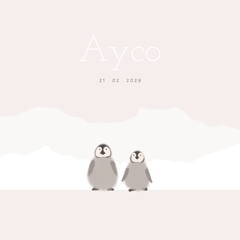 Lief gender neutraal geboortekaartje met twee pinguïns, een grote broer of zus met broertje of zusje. Op de achtergrond witte bergen en een mooie beige kleur met een subtiel papiermotief. De roséfolie maakt dit rustige geboortekaartje Ayco helemaal af! Liever goudfolie, zilverfolie of koperfolie? Pas het kaartje geheel naar je eigen smaak aan in de editor.