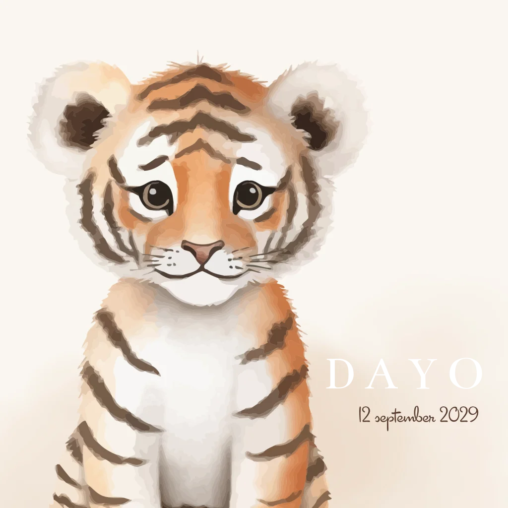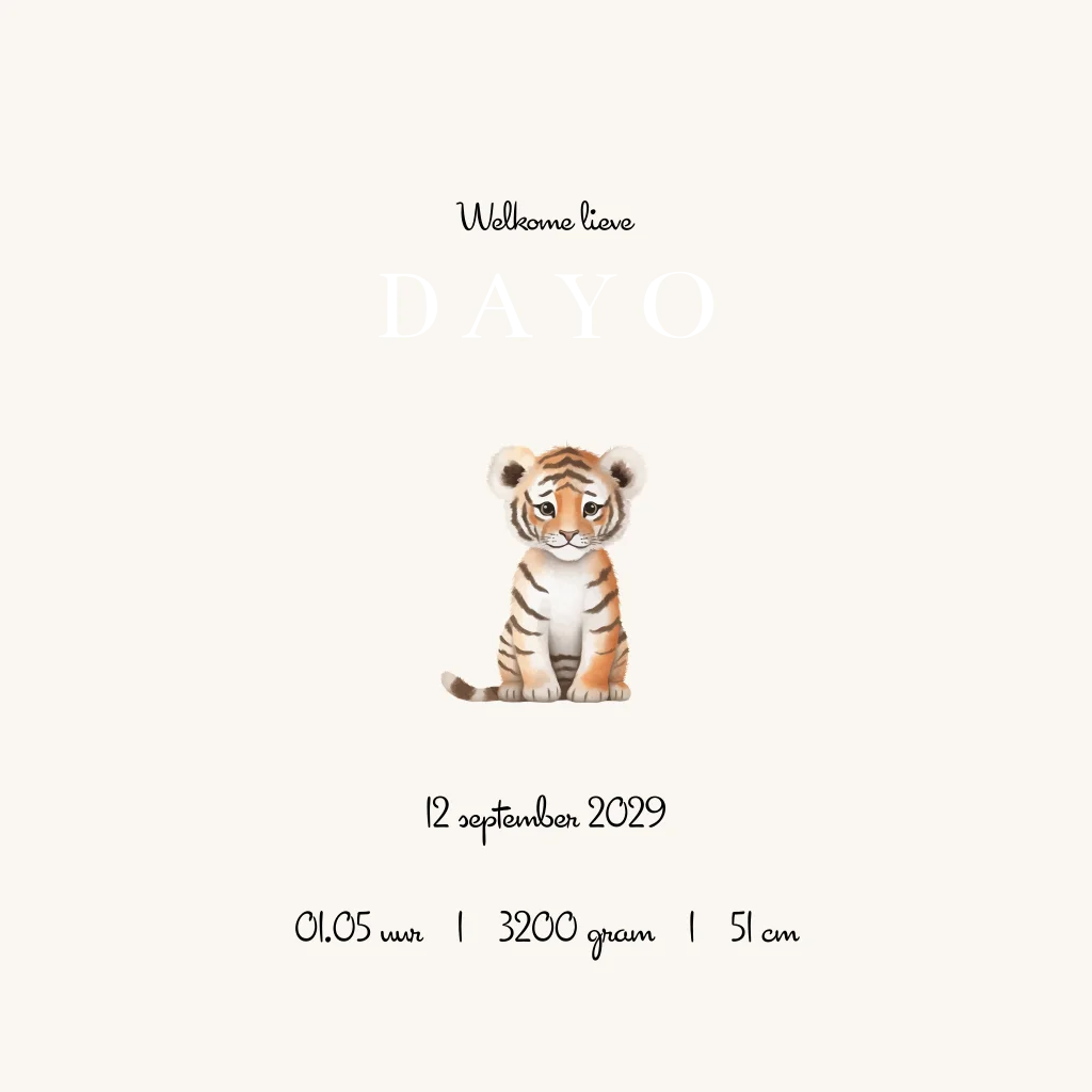 Op zoek naar een leuk en uniek kaartje voor de geboorte van je kindje? Bekijk dan dit prachtige kaartje Dayo met een schattig geschilderd tijgertje. Dit lieve dieren kaartje is perfect voor een jongen of meisje. De gouden foliedruk geeft een luxe touch aan dit lieve kaartje. Je kunt het kaartje naar eigen smaak aanpassen in de editor. Hulp nodig? We helpen graag!