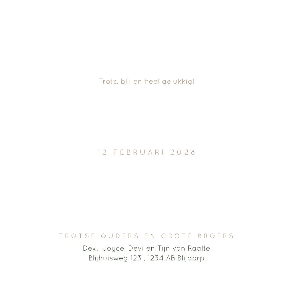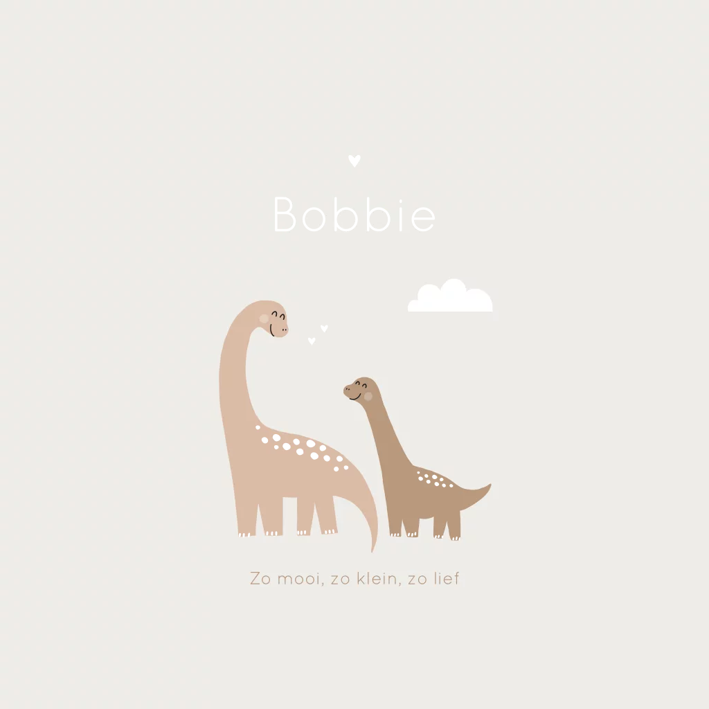 Lief dino geboortekaartje in trendy kleuren voor een zoon of dochter. Op dit unisex babykaartje Bobbie zie je twee dinosaurussen, een wolkje en hartjes. De goudkleurige elementen worden gedrukt in echt foliedruk, dat geeft een luxe uitstraling aan dit rustige geboortekaartje. Teksten en kleuren kun je eenvoudig aanpassen in de editor. Dit geboortekaartje is ook mogelijk voor een andere gezinssamenstelling.