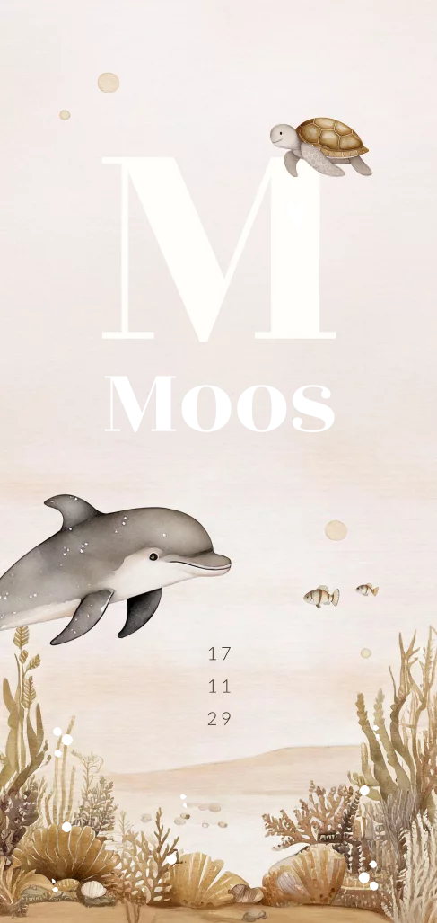 Unisex geboortekaartje met initiaal, dolfijn, schildpad en foliedruk. Dit langwerpige geboortekaartje Moos heeft een onderwaterwereld thema met een initiaal en onderwaterwereld dieren in bruintinten. Teksten en kleuren zijn makkelijk aan te passen in onze editor. Maak het geheel af met een metallic beige kleur envelop en bijpassende sluitzegel. Hulp nodig? We staan voor je klaar!