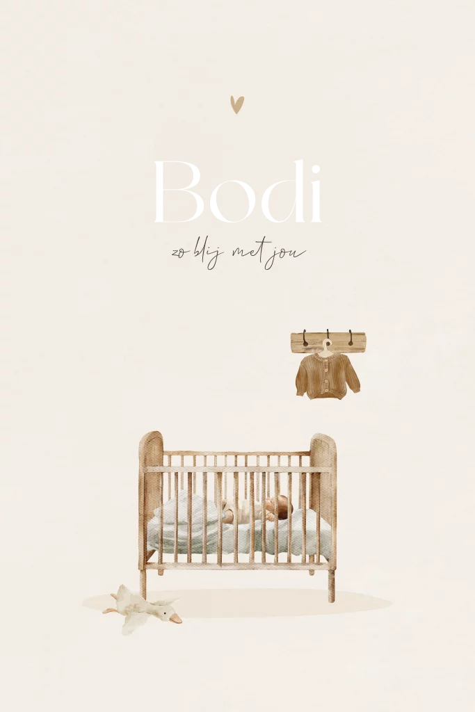 Dit unisex geboortekaartje met ronde hoeken is fantastisch voor zowel een jongen als een meisje. Op dit geboortekaartje Bodi zie je een lief aquarel getekend baby'tje liggen in een ledikant met daarboven een getekende kapstok met een vestje. Onder het ledikant ligt een gans knuffeltje op de grond.