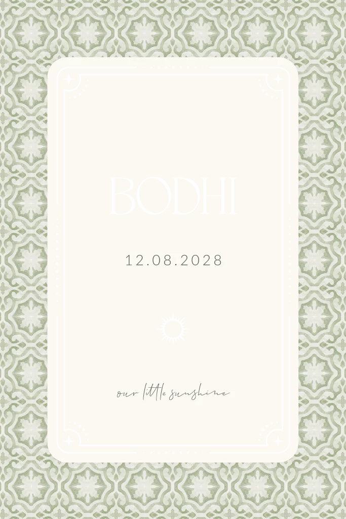 Dit prachtige unisex geboortekaartje met een mediterraans patroon en boho uitstraling is een unieke keuze voor de aankondiging van de geboorte van jullie kindje. Het exclusieve kaartje is voorzien van echt foliedruk met afgeronde hoeken, wat zorgt voor een elegante en stijlvolle uitstraling. Dit unisex geboortekaartje Bodhi is perfect voor zowel een dochter als een zoon. De bijpassende donkergroene envelop en een sluitzegel met een mediterraans patroon maken het geheel compleet.