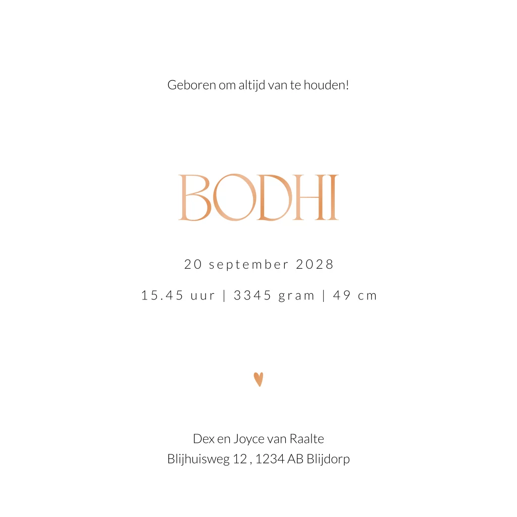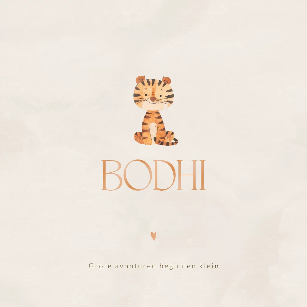 Unisex geboortekaartje met hoogglansdruk. Dit geboortekaartje is door de neutrale kleuren geschikt voor zowel een jongen als een meisje. De kaart is overwegend rustig met een lieve illustratie van een tijger. De koperfolie maakt dit geboortekaartje Bodhi een ware eyecatcher. Kies voor dit unieke geboortekaartje en maak de aankondiging van de geboorte van jullie kindje extra speciaal.