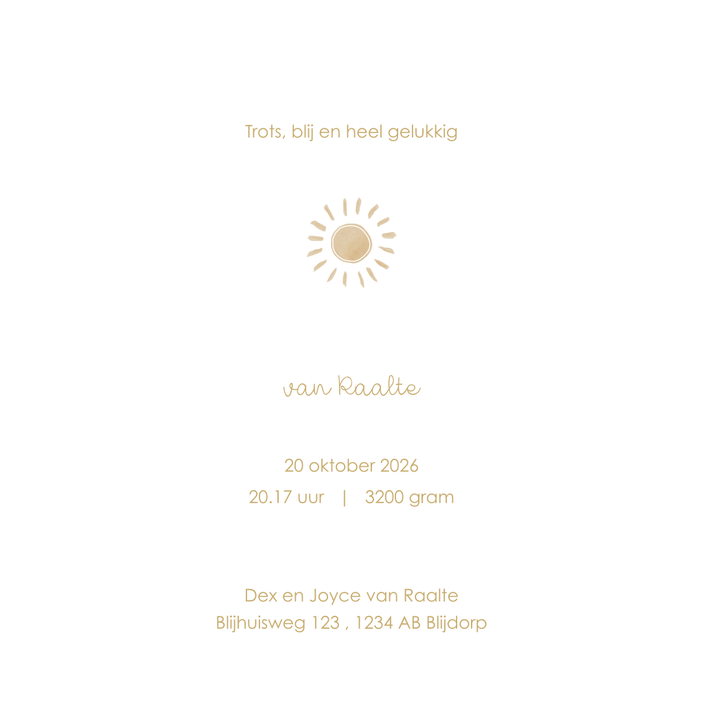Neutraal unisex geboortekaartje met zon en goudfolie