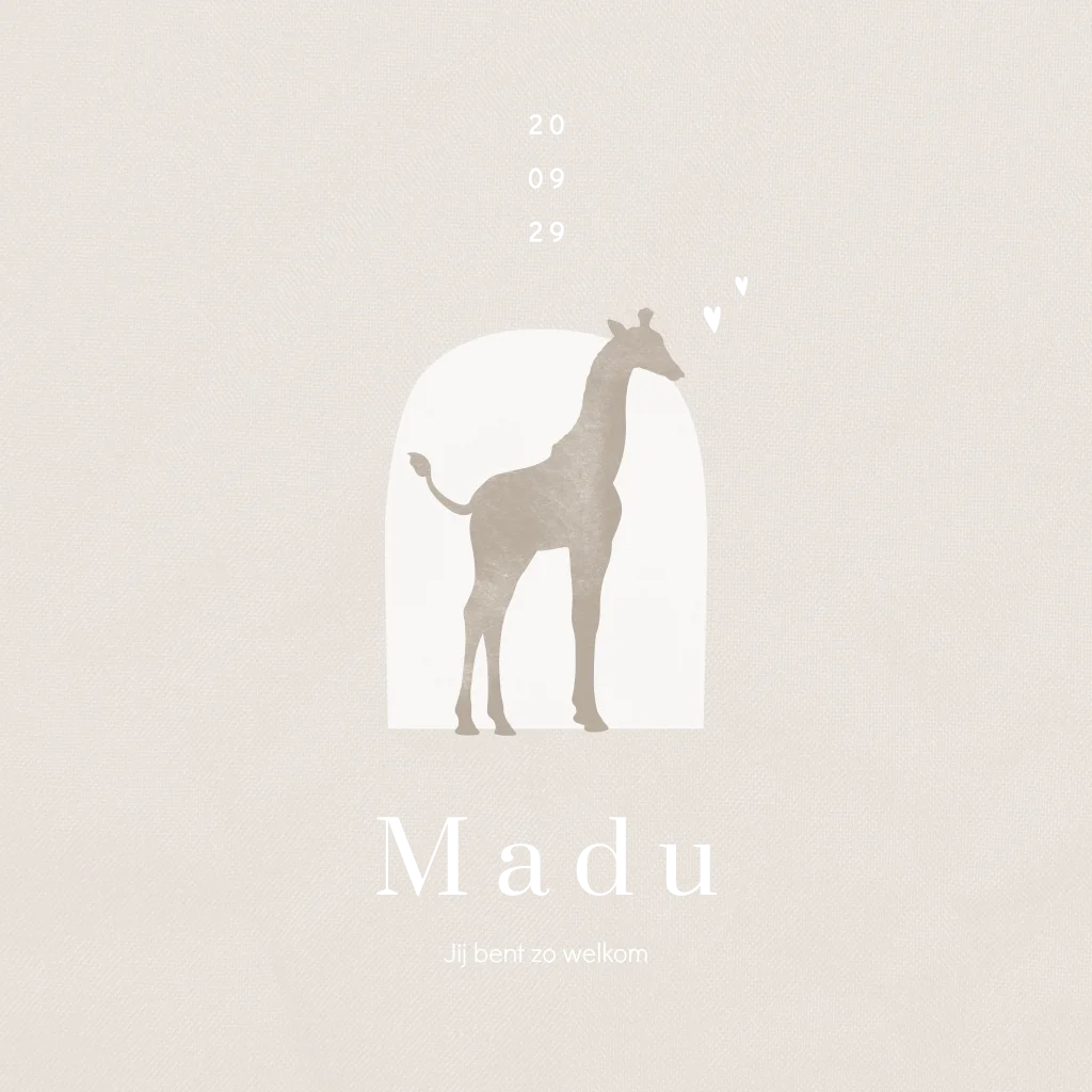 Neutraal geboortekaartje met silhouet en foliedruk voor een jongen of meisje. Op dit silhouet geboortekaartje Madu staat een lief baby girafje voor een arch vorm met hartjes. De naam van jullie zoon of dochter wordt, samen met de geboortedatum en hartjes, gedrukt in echt goudfolie. De foliedruk geeft een luxe uitstraling aan dit overwegend rustige geboortekaartje. Pas dit kaartje naar je eigen smaak aan in de editor. Ook mogelijk met andere foliebedrukking, waaronder holografisch folie, roséfolie of zwartfolie.