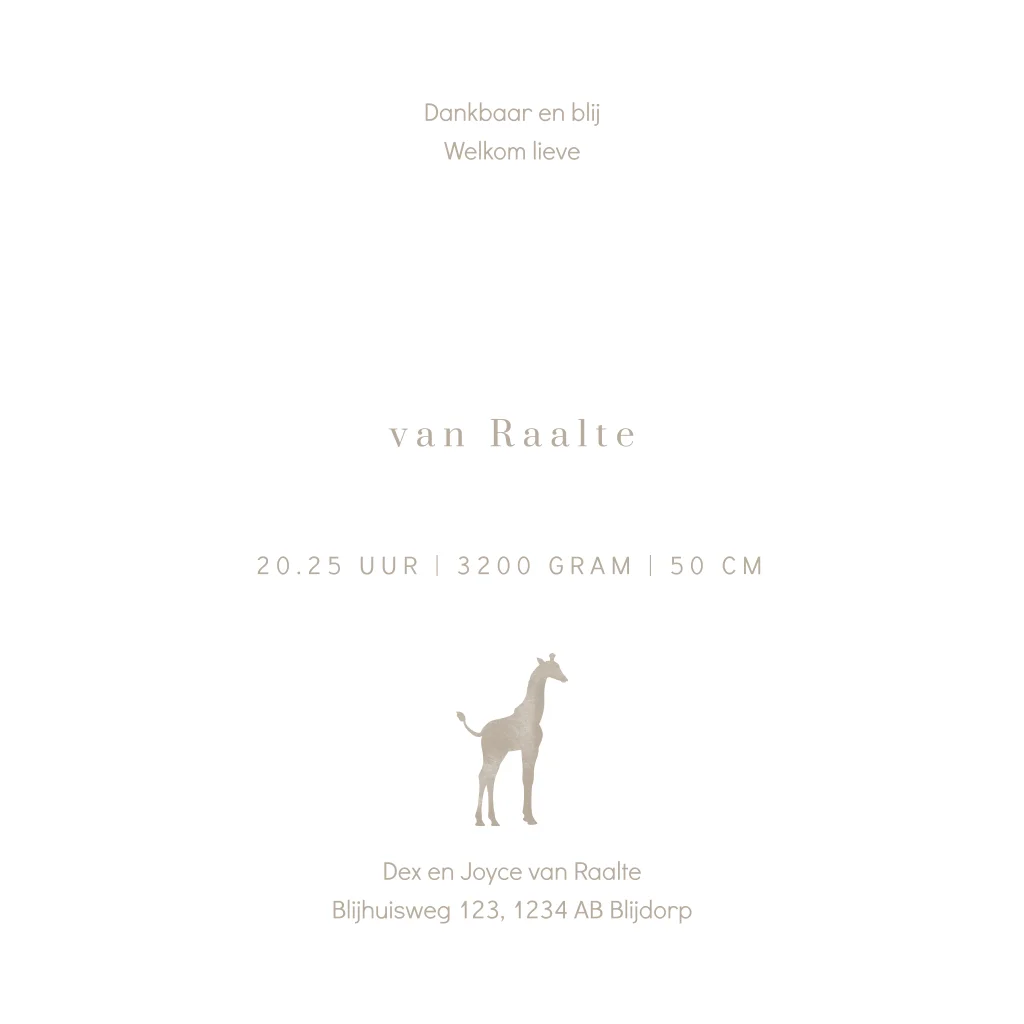 Baby giraffe geboortekaartje genderneutraal met goudfolie
