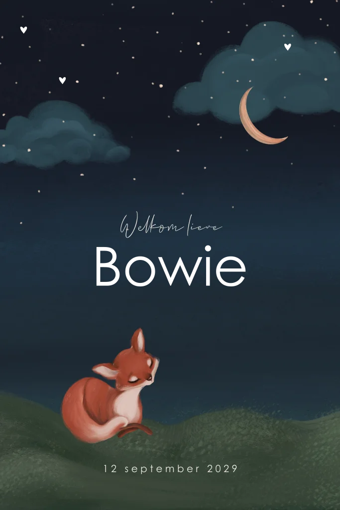 Dit geboortekaartje Bowie is unisex en perfect voor jongen of meisje! Het kaartje is voorzien van gouden foliedruk en heeft een bosnacht thema. De vos is het hoofdpersonage op het kaartje en staat voor avontuur en natuur. De kleuren zijn donkerblauw en goud, wat perfect bij elkaar staat. De folie maakt het kaartje extra luxe.