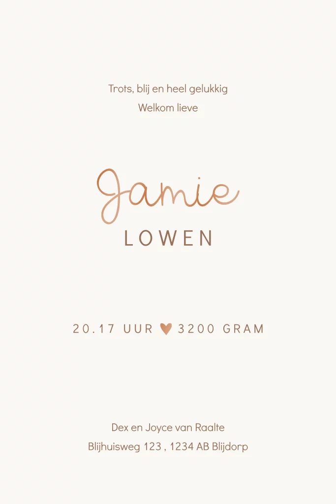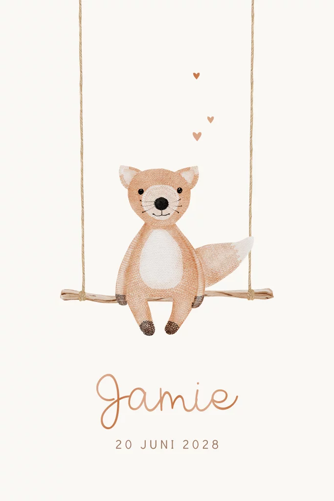 Lief unisex geboortekaartje voor de geboorte van jullie zoon of dochter. Op dit babykaartje Jamie een vosje die op een houten schommel aan het spelen is. De naam van jullie kindje en de hartjes worden gedrukt in hoogglans. Dat geeft deze kaart een extra luxe uitstraling. Wil je liever een andere kleur hoogglans? Pas dit gemakkelijk aan in onze editor.