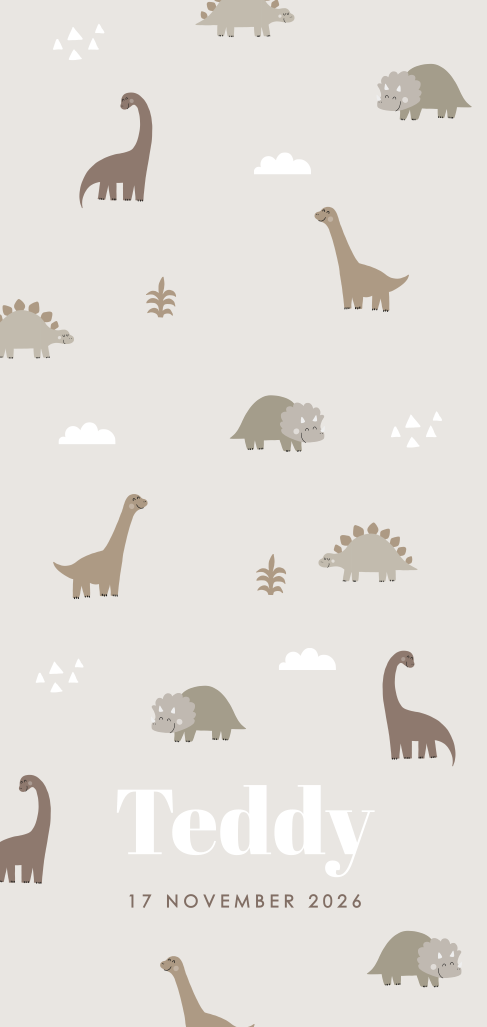Hip genderneutraal geboortekaartje voor een jongen of meisje. Op dit trendy babykaartje Teddy een patroon van dinosaurussen. De gouden elementen en de naam van jullie zoon of dochter worden gedrukt in écht goudfolie. Hierdoor springt de naam van jullie kindje er extra uit. De ronde hoeken maken het kaartje helemaal af.