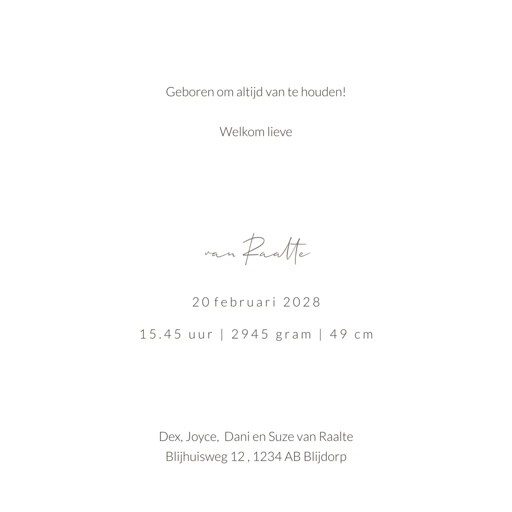 Pas dit geboortekaartje voor jullie zoon of dochter naar eigen wens aan in de online editor. Dit kaartje is ook mogelijk in een andere gezinssamenstelling.