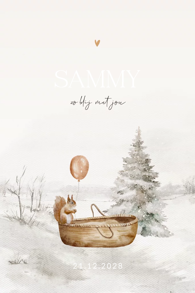 Unisex geboortekaartje met eekhoorn en mand in een winterlandschap