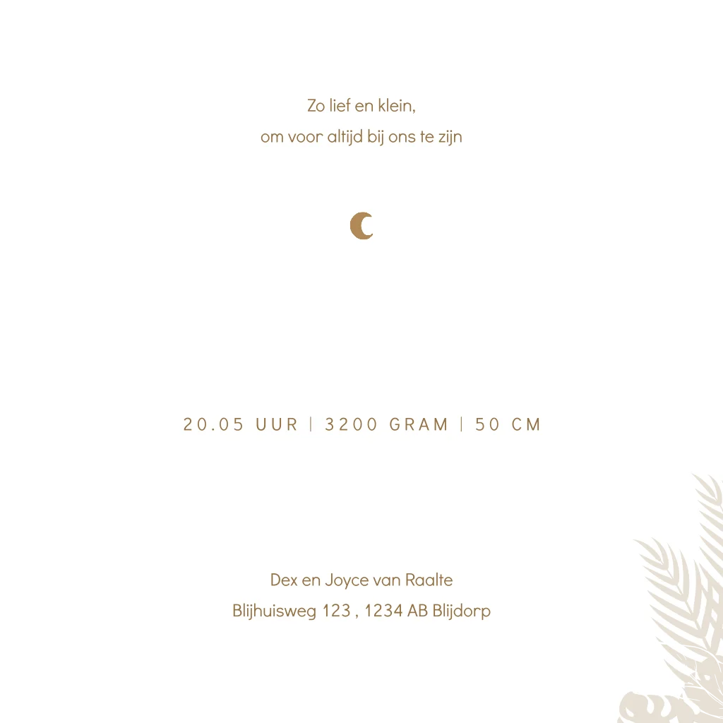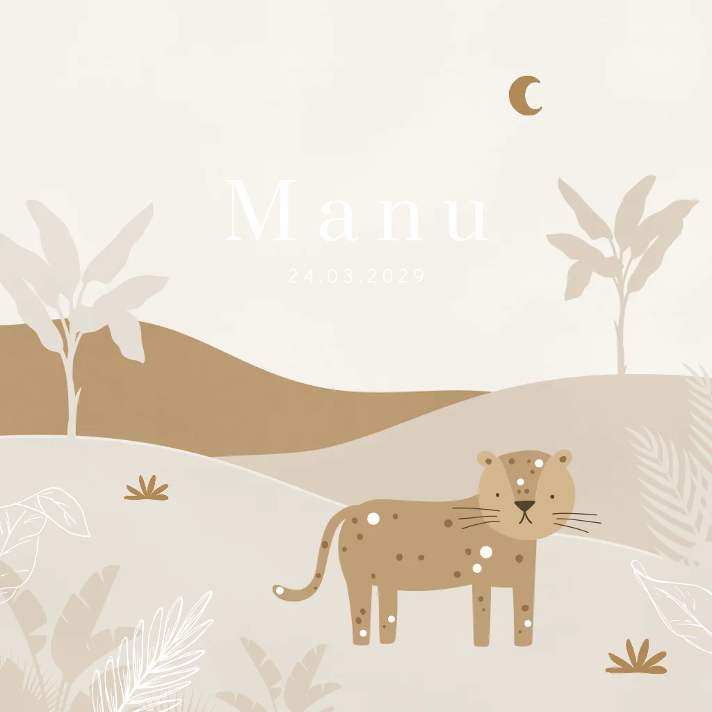 Hip unisex geboortekaartje in jungle stijl. Op dit babykaartje Manu een ton sur ton landschap in bruine tinten met palmbomen, maan en jungle bladeren. Op de voorgrond een lief luipaardje met vlekken in écht goudfolie. De naam van jullie kindje en de botanische bladeren worden ook gedrukt in goudfolie. De foliedruk geeft een sprankelende touch aan dit geboortekaartje in aardetinten. Pas de teksten, kleuren en foliedruk gemakkelijk aan in de editor.
