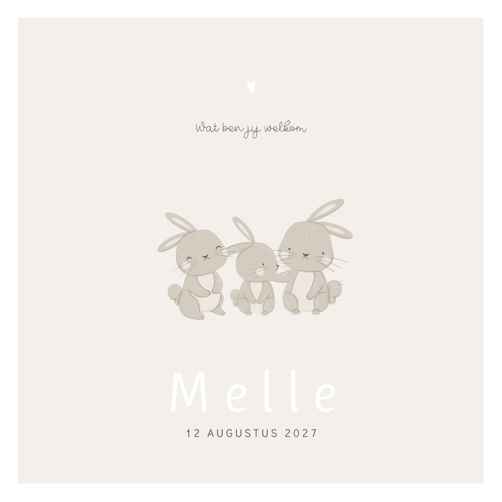 Lief unisex geboortekaartje met drie konijntjes en goudfolie