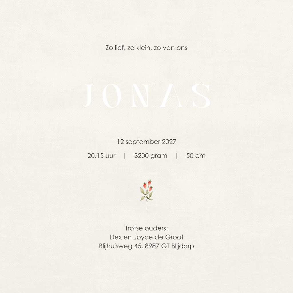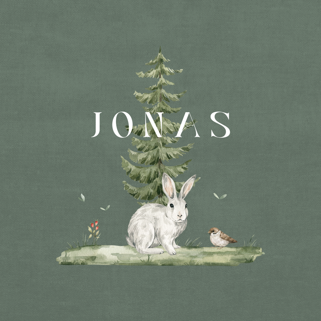 Lief unisex geboortekaartje met bosdieren en een groene linnenlook achtergrond. Dit geboortekaartje Jonas toont een tekening van een schattig konijntje dat rustig tussen de bloemetjes en vogeltjes zit. Het geboortekaartje is geschikt voor zowel een jongen of een meisje. De naam van jullie zoon of dochter wordt gedrukt in echt goudfolie. Dat geeft een luxe uitstraling aan dit geïllustreerde geboortekaartje met konijn. Pas de kaart geheel naar eigen wens aan in de editor.