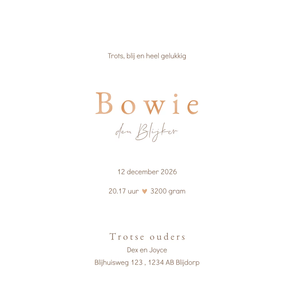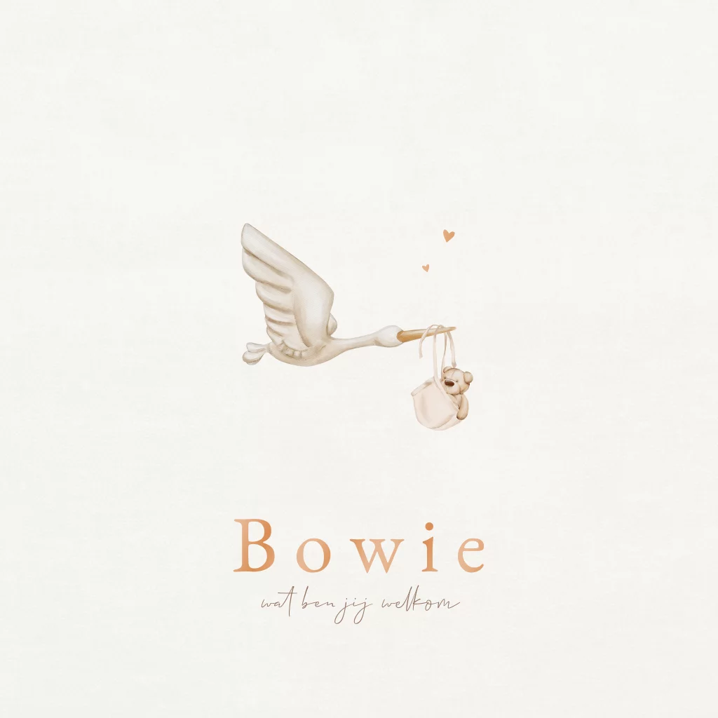 Lief unisex geboortekaartje met hoogglans en een lichte linnenlook achtergrond. Op dit nude geboortekaartje zie je een illustratie van een vliegende vogel die een teddybeertje bezorgd, jullie kindje! Dit rustige geboortekaartje is zowel geschikt voor een jongen als meisje. Op dit kaartje Bowie wordt de naam gedrukt in hoogglans. Liever een andere kleur of gaan voor foliedruk? Dit is aan te passen in de editor.