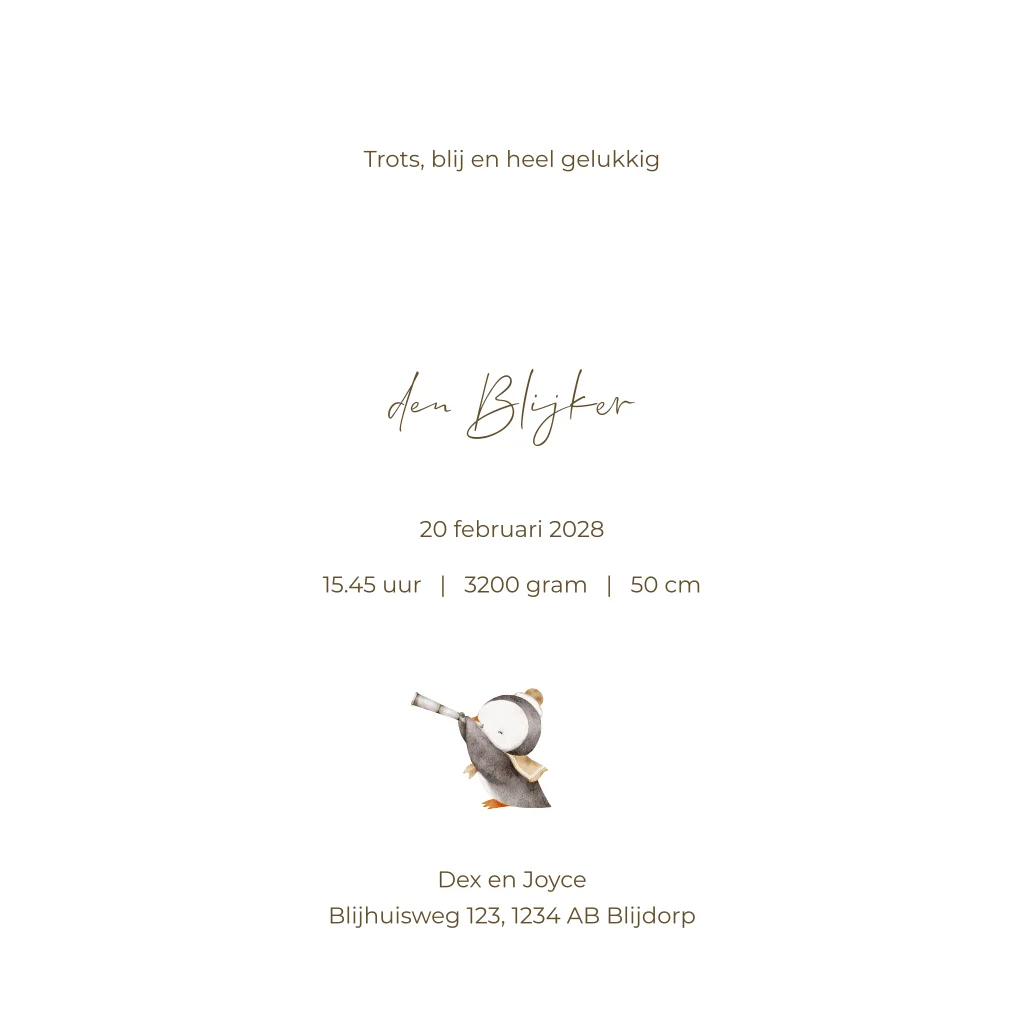 Dieren geboortekaartje met een illustratie van een walvis met pinguïn, vuurtoren en boot. Dit unisex geboortekaartje Louen heeft mooie natuurlijke tinten waardoor deze geschikt is voor zowel een jongen als een meisje. De goudfolie geeft een luxe touch aan dit overwegend rustige kaartje. Pas het geboortekaartje geheel naar eigen wens aan in de editor. Hulp nodig? Bel, mail of chat ons gerust!