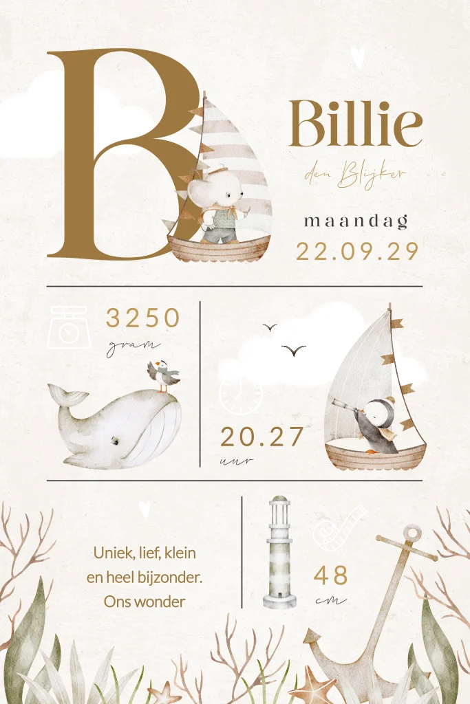 Unisex geboortekaartje voorletter, geboortegegevens, boot en zeedieren