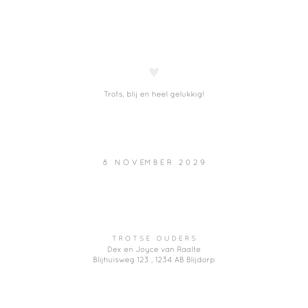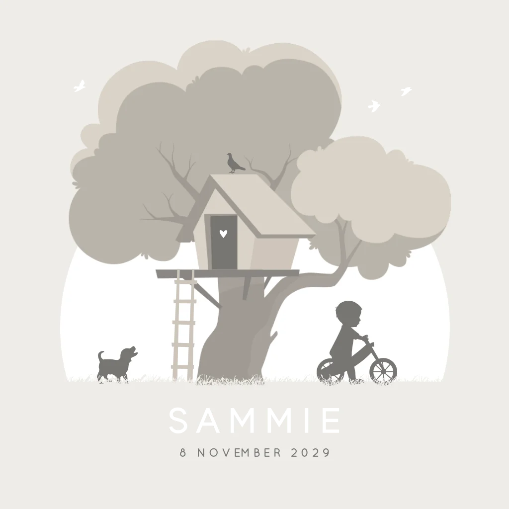 Genderneutraal geboortekaartje voor een jongen of meisje. Op dit unisex geboortekaartje een grote boom met daarin een boomhut, de droom van ieder kind! Door de lucht vliegen vogels door de lucht. Op de voorgrond zie je een silhouet van een hond en van een kindje op een loopfietsje. Door het gebruik van greige tinten heeft dit babykaartje Sammie een rustige uitstraling. De naam van jullie zoon of dochter wordt gedrukt in echt goudfolie. Dat geeft net dat beetjes extra's aan dit neutrale geboortekaartje.