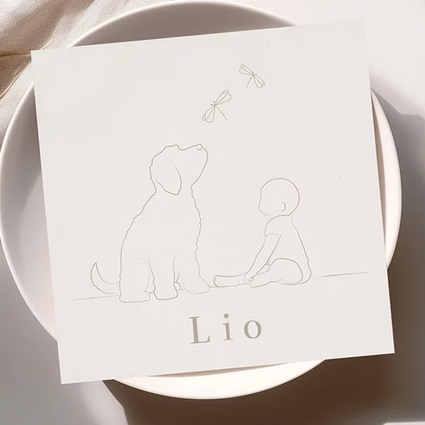 Een prachtig unisex geboortekaartje voor een jongen of meisje waarbij het belangrijk is dat jullie huisdier ook onderdeel is van de familie. Je ziet op dit geboortekaartje Lio een lijntekening van een labradoodle hond met baby. In combinatie met de beige achtergrond geeft dit een prachtige en rustige uitstraling. Geen huisdier of een ander huisdier? Ook dit kun je aanpassen of we helpen je graag.